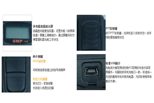 二、SMP 268 商務(wù)型對(duì)講機(jī) SMP 268商務(wù)型對(duì)講機(jī),專門(mén)應(yīng)用于餐飲酒店、連鎖賓館、零售管理、公關(guān)活動(dòng)等商業(yè)與服務(wù)。 【產(chǎn)品信息】