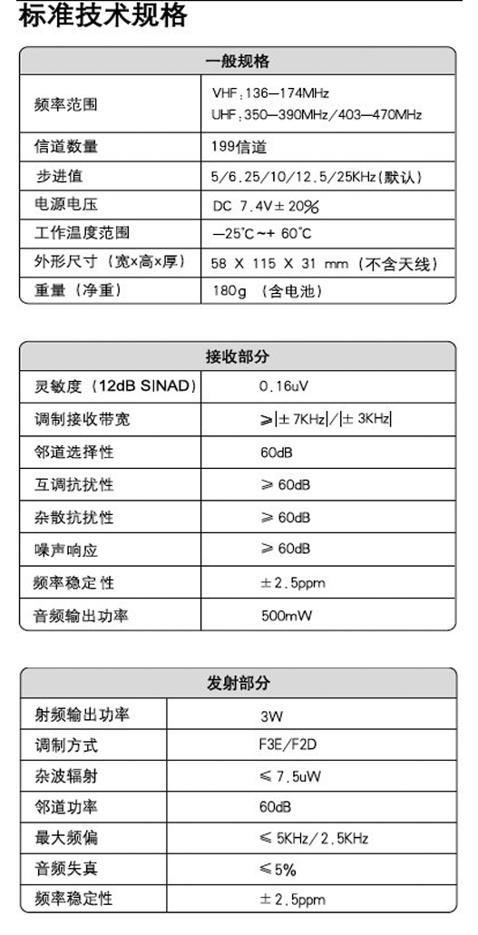 1. 語音報號功能 2. 監(jiān)聽功能 3. TOT限時發(fā)射 4. 電池省電功能 5. 電池低電壓警報 6. CTCSS(50個)/ DCS(105組) 7. 16個半雙工信道 8. 第16信道掃描功能 9. 寬/窄信道帶寬選擇 10.高/低輸出功率選擇:3-4W 11.電腦編程