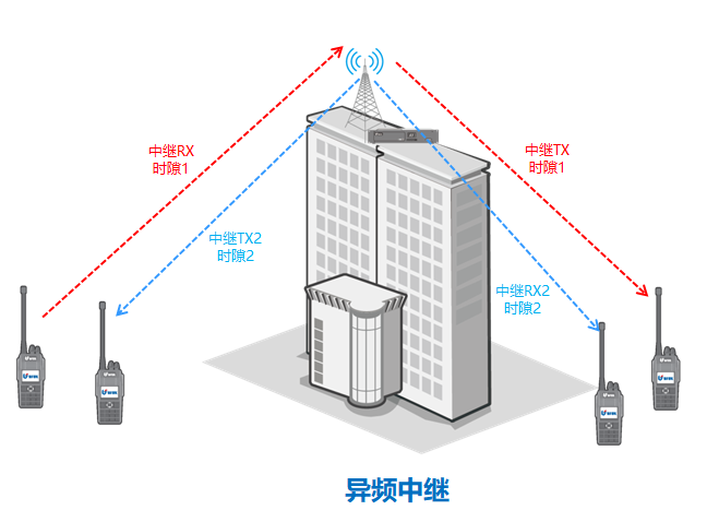 異頻中繼組網(wǎng) BF-TR8500基于DMR/PDT技術(shù)標準技術(shù)開發(fā),通過一組同段的頻率組(VHF或者UHF)作為中繼臺的上行(Rx)與下行(Tx)頻率,由于發(fā)射接收頻率不同, 終端在使用時也需要設(shè)置與中繼臺相對應(yīng)的上行與下行頻率。Rx≠Tx。