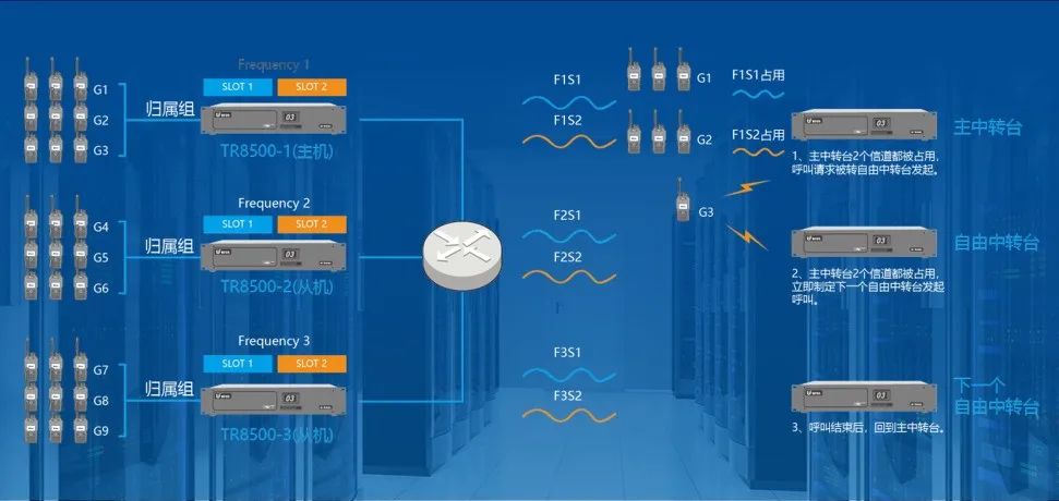 信道資源動態(tài)分配 BF-TR8500數(shù)字中繼臺可作為SVT系統(tǒng)的信道機使用,通過專用的信道控制器來管理多臺信道機組成的基站。在SVT系統(tǒng)中,所有的信道機的提供的信道資源將被統(tǒng)一管理和分配。只要信道負載未被占滿,終端用戶無需要手動切換即可進行呼叫,有效地提高業(yè)務(wù)信道資源利用率和呼通率。本功能廣泛適合應(yīng)用在話務(wù)量密集、工作分組繁多的企業(yè)。