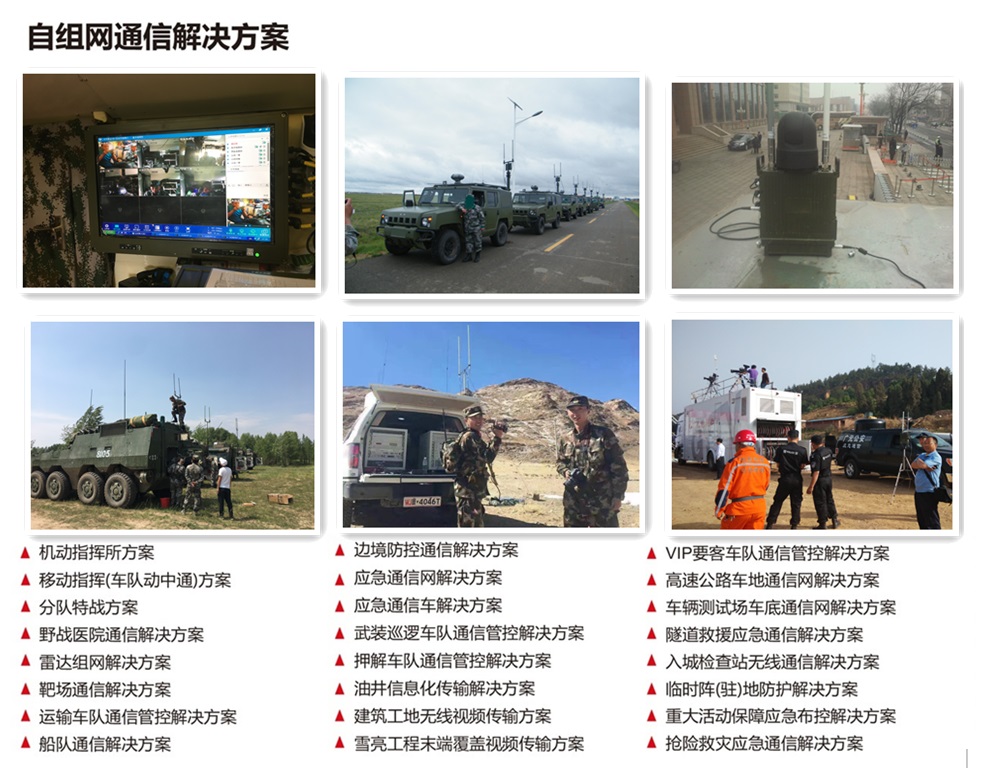 解決方案: 1.移動指揮(車隊動中通)方案 車隊移動中通信是部隊作戰、訓練的基本需求,不論是作戰部隊機動還是物資運輸,指揮員都需要實時了解和掌握車隊行進狀況。 自組網設備可支持行進間車輛動態組網,可適應城市、山區等復雜地形條件下車隊的動中通,可支持車隊行進態勢、電話會議、視頻會議、共享電子白板等多媒體指揮調度功能。 2.分隊特戰方案 自組網設備應用于分隊特戰場景,可實現分隊成員間信息的互聯互通,用于實現分隊內部語音通信、視頻信息、位置信息,以及偵察、態勢信息的傳遞與共享,便于分隊成員實時了解其他成員的位置、敵我態勢,實時溝通信息和下達指令。 3.臨時陣(駐)地防護方案 部隊訓練、演習、作戰過程中,陣(駐)地面臨空中、地面的多種潛在威脅,利用自組網設備與各種防護警戒手段相結合,可在陣(駐)地周界按需快速部署警戒區域,可將警戒信息實時傳輸到指揮中心,實現對駐地指揮所、人員、作戰裝備、重要物資的全方位警戒防護,確保陣(駐)地安全。 4.搶險救災應急通信解決方案 當發生重大災害(如地震、海嘯、洪水、泥石流、重大交通事故等)時,通常伴隨的都是通信等基礎設施的損毀和癱瘓,平時使用的通信手段基本失效,受災地區基本處于一個信息孤島的狀態,而一個有力的指揮通訊系統是有效開展搶險救災行動的必要條件。 自組網設備可以迅速在受災現場展開部署,快速搭建指揮通信網絡,為救災指揮提供實時信息,指揮部可以藉此迅速了解掌握受災及損失狀況,合理部署救災資源,制定救災方案、統一指揮各救災單位聯合工作,采取有力措施迅速展開救災行動,最大程度上降低災害損失。