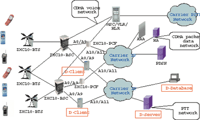 主頁(http://www.130131.com):中興通訊CPTT集群通信系統(tǒng)介紹 一 中興CPTT集群通信系統(tǒng)概述 PTT(Push To Talk),是無線領(lǐng)域?qū)?ldquo;一按即通”通信呼叫方式的簡稱。通過使用移動終端的PTT鍵,按下時進(jìn)行呼叫,抬起時被動接聽。其特點(diǎn)是呼叫建立時間快,說話時才占用信道,接收時只監(jiān)聽信道,既可以一對一,也可以一對多方式通信,接收方不需要摘機(jī)即可隨時接收呼叫信息。由于PTT技術(shù)的呼叫速度快,系統(tǒng)資源使用效率高,被廣泛應(yīng)用于對講系統(tǒng)、集群系統(tǒng)、移動蜂窩系統(tǒng)中的指揮調(diào)度功能。近幾年,隨著無線通信技術(shù)和業(yè)務(wù)運(yùn)營的發(fā)展,PTT技術(shù)也逐步轉(zhuǎn)向個人應(yīng)用,例如年輕時尚人士之間或小團(tuán)體內(nèi)的實(shí)時聊天、家庭內(nèi)部成員之間的通信等。在一些移動通信發(fā)達(dá)的國家和地區(qū),PTT業(yè)務(wù)與傳統(tǒng)移動業(yè)務(wù)結(jié)合,或與集群業(yè)務(wù)的共網(wǎng)發(fā)展,已經(jīng)成為一種趨勢,既滿足了市場需求,也促進(jìn)了業(yè)務(wù)運(yùn)營和相關(guān)產(chǎn)業(yè)的發(fā)展。 CPTT是中興通訊獨(dú)立推出的一種基于CDMA網(wǎng)絡(luò)的PTT技術(shù)。CPTT可提供多種集群業(yè)務(wù): ● 一對一的私密呼叫和一對多群組呼叫;可設(shè)定用戶的優(yōu)先級,并根據(jù)用戶的優(yōu)先級使用強(qiáng)插強(qiáng)拆功能。 ● 還可以提供集群系統(tǒng)中所需要的系統(tǒng)尋呼、群組尋呼、子群組尋呼、專用PTT業(yè)務(wù)等特殊業(yè)務(wù)。 ● CPTT系統(tǒng)可對不同的話務(wù)群組進(jìn)行分類,例如永久型群組和臨時型群組,用戶可對其群組內(nèi)成員進(jìn)行管理。 除了集群業(yè)務(wù)以外,CPTT還具有所有傳統(tǒng)的蜂窩業(yè)務(wù),如短消息、定位、VPN等,這些業(yè)務(wù)和集群業(yè)務(wù)結(jié)合起來,將為集團(tuán)用戶提供綜合服務(wù)。 CPTT技術(shù)比傳統(tǒng)集群通信方式有很多的優(yōu)勢: ● 技術(shù)先進(jìn)。CDMA技術(shù)和系統(tǒng)的先進(jìn)性,可為集群技術(shù)帶來新的業(yè)務(wù)發(fā)展空間。 ● 業(yè)務(wù)豐富。特別是與公眾移動業(yè)務(wù)進(jìn)行捆綁,優(yōu)勢互補(bǔ),可大量吸引用戶入網(wǎng)。 ● 投資少,見效快,運(yùn)營成本低。CPTT基于中興CDMA系統(tǒng)成熟網(wǎng)絡(luò),只需要對系統(tǒng)作稍許升級和補(bǔ)充,即可實(shí)現(xiàn)業(yè)務(wù)承載。 CPTT的一個重要特點(diǎn)在于PTT業(yè)務(wù)可完全承載于現(xiàn)有的中興cdma2000 1x RAN分組數(shù)據(jù)網(wǎng)絡(luò)。在新增該業(yè)務(wù)時,只需對原中興cdma2000 1x網(wǎng)絡(luò)的BSS部分進(jìn)行軟件升級,并新增部分服務(wù)器和數(shù)據(jù)庫,即可在中興cdma2000 1x系統(tǒng)上實(shí)現(xiàn)PTT業(yè)務(wù)功能。 中興通訊提供CPTT終端,最新推出的CPTT終端提供一個特殊設(shè)計的按鈕,一個附加的揚(yáng)聲器及大容量的電池。新終端不僅支持豐富的集群業(yè)務(wù),也支持傳統(tǒng)的語音業(yè)務(wù)、短消息業(yè)務(wù)和分組數(shù)據(jù)業(yè)務(wù)。 二 中興通訊CPTT技術(shù)原理 中興通訊CPTT方案,具有獨(dú)家的技術(shù)優(yōu)勢,成功解決了基于CDMA技術(shù)的集群業(yè)務(wù)關(guān)鍵技術(shù),擁有核心專利。在CDMA領(lǐng)域具有高的起點(diǎn)和高的市場競爭力,完全著眼未來市場競爭。為了能夠在CDMA網(wǎng)絡(luò)上進(jìn)行PTT通信,并且不影響CDMA網(wǎng)絡(luò)的各項(xiàng)業(yè)務(wù),CPTT圍繞著無線信道共享和快速鏈接這兩項(xiàng)關(guān)鍵技術(shù)提出解決方案,使新增的PTT業(yè)務(wù)不會對傳統(tǒng)移動業(yè)務(wù)和網(wǎng)絡(luò)資源帶來不利影響。CPTT業(yè)務(wù)網(wǎng)絡(luò)結(jié)構(gòu)如圖1。其中D-Client、D-Server、D-Database為新增網(wǎng)元。