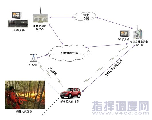 主頁(yè)(http://www.130131.com):時(shí)代星光:森林防火無(wú)線應(yīng)急指揮方案 本系統(tǒng)由一套車(chē)載數(shù)字圖像采集傳輸系統(tǒng)、TFDM超短波無(wú)線圖像傳輸系統(tǒng)、3G無(wú)線圖像傳輸系統(tǒng)、便攜式圖像接收站、硬盤(pán)錄像機(jī)、監(jiān)視器、車(chē)載對(duì)講系統(tǒng)和衛(wèi)星電話等設(shè)備組成,用于某市全市范圍內(nèi)森林防火應(yīng)急指揮無(wú)線音視頻傳輸。由于森林防火地段皆處山區(qū),山脈的走勢(shì)會(huì)極大的影響無(wú)線信號(hào)的傳輸,所以我們?cè)O(shè)計(jì)TFDM超短波無(wú)線圖像傳輸系統(tǒng)和3G無(wú)線圖像傳輸系統(tǒng)共同使用的方法,以實(shí)現(xiàn)兩種傳輸方式的良好互補(bǔ)。 ![]() 關(guān)于此圖像傳輸系統(tǒng),重點(diǎn)說(shuō)明以下幾點(diǎn): 覆蓋范圍: 此系統(tǒng)包含兩個(gè)部分的覆蓋范圍,一是3G車(chē)載系統(tǒng)的覆蓋范圍,只要有電信3G信號(hào)(在XX省內(nèi),電信覆蓋范圍最廣)覆蓋的地方就可以使用3G網(wǎng)絡(luò)進(jìn)行圖像傳輸;二是TFDM超短波無(wú)線圖像傳輸系統(tǒng)的覆蓋范圍,以指揮車(chē)為中心的10~30km捍衛(wèi)了皆可以進(jìn)行無(wú)線圖像傳輸,具體距離要根據(jù)當(dāng)?shù)氐牡匦魏碗姶怒h(huán)境決定。 只要事故發(fā)生地點(diǎn)處于這兩個(gè)覆蓋范圍之內(nèi),就可以使用車(chē)載無(wú)線圖像傳輸設(shè)備進(jìn)行圖像傳輸。 為了增大覆蓋范圍,后續(xù)可以增加TFDM單兵采集系統(tǒng)和TFDM便攜式中繼系統(tǒng),以增大TFDM超短波無(wú)線圖像傳輸系統(tǒng)的覆蓋范圍。 圖像傳輸流程 圖像的采集由車(chē)頂攝像機(jī)完成,采集好的圖像一方面輸入車(chē)載硬盤(pán)錄像機(jī)進(jìn)行存儲(chǔ),另外一方面輸入TFDM超短波無(wú)線圖像傳輸系統(tǒng)和3G無(wú)線圖像傳輸系統(tǒng)進(jìn)行圖像傳輸。 只要有3G信號(hào)的地方,可以采用3G網(wǎng)絡(luò)將圖像信息送到3G基站,然后經(jīng)過(guò)Internet公網(wǎng)傳輸?shù)浇⒃谀呈辛謽I(yè)局指揮中心的3G服務(wù)器上。對(duì)這個(gè)圖像,一方面可以進(jìn)行顯示,另外一方面可以轉(zhuǎn)發(fā),各個(gè)區(qū)縣林業(yè)局安裝的客戶端上都可以看到3G傳回的音視頻信息了。 在沒(méi)有3G信號(hào)的地方,我們采用TFDM專(zhuān)網(wǎng)進(jìn)行圖像傳輸,接收點(diǎn)使用便攜式圖像接收站,可以在多個(gè)區(qū)縣林業(yè)局進(jìn)行調(diào)換和使用,車(chē)輛上采集的圖像進(jìn)入到TFDM車(chē)載無(wú)線圖像發(fā)射機(jī),然后通過(guò)車(chē)載吸盤(pán)天線發(fā)射出去,然后在各區(qū)縣林業(yè)局進(jìn)行接收。便攜式圖像接收站帶有網(wǎng)絡(luò)接口,接收下來(lái)之后,通過(guò)林業(yè)局內(nèi)部網(wǎng)絡(luò)就可以轉(zhuǎn)發(fā)到某市林業(yè)局指揮中心,從而第一時(shí)間獲取火災(zāi)現(xiàn)場(chǎng)的圖像信息了。 此外,我們還配置了車(chē)載臺(tái)和海事衛(wèi)星電話,當(dāng)緊急情況發(fā)生的時(shí)候可以采用350M車(chē)載臺(tái)和海事衛(wèi)星電話和外界取得聯(lián)系。 (本站原創(chuàng),廠商供稿。未經(jīng)授權(quán)不得轉(zhuǎn)載,轉(zhuǎn)載敬請(qǐng)注明來(lái)源:“中國(guó)集群通信網(wǎng) www.130131.com ”,如需轉(zhuǎn)載,請(qǐng)注明來(lái)源和作者,謝謝合作。 (中國(guó)集群通信網(wǎng) | 責(zé)任編輯:陳曉亮) |