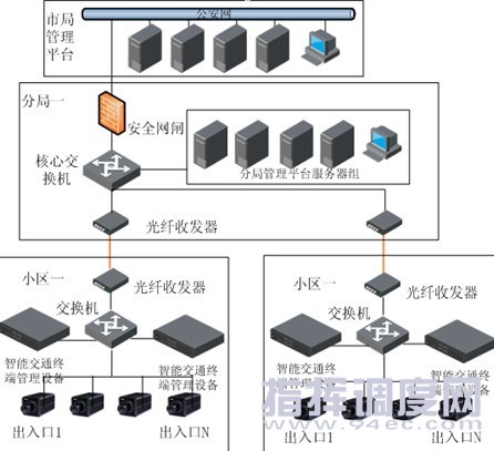 大華小區(qū)出入口監(jiān)控卡口系統(tǒng)主要由嵌入式一體化攝像機、補光燈、交換機、電源、防雷設(shè)備、立桿等組成。每個小區(qū)所有出入口的卡口抓拍攝像機通過網(wǎng)線匯總到寬帶接入點的交換機上,交換機與光纖收發(fā)器相連轉(zhuǎn)換成光信號后通過光纖將抓拍數(shù)據(jù)上傳到分局管理平臺,由分局管理平臺管理和存儲,并通過分局網(wǎng)閘接入公安網(wǎng)。 系統(tǒng)結(jié)構(gòu)設(shè)計如下:  前端無錄像需求方案系統(tǒng)架構(gòu)
