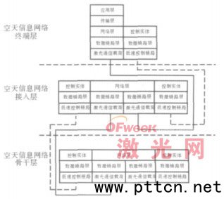 圖4 組網(wǎng)載荷原理樣機(jī)與接口板 空天通信網(wǎng)絡(luò)節(jié)點(diǎn)組網(wǎng)載荷原理樣機(jī)的高速背板具有多個(gè)高速接口,可根據(jù)需求裝配多塊接口板。通過高速背板與交換板,數(shù)據(jù)可以在接口板之間進(jìn)行直接交換,不需要軟件控制。接口板的多個(gè)并行SMA接口可分別與通信鏈路載荷|(包括微波和激光兩種體制)和控制鏈路載荷連接。 2、空天信息網(wǎng)絡(luò)協(xié)議模型 高速空間激光通信系統(tǒng)作為空天信息網(wǎng)絡(luò)節(jié)點(diǎn)的主要通信載荷,與組網(wǎng)載荷協(xié)同工作?仗焱ㄐ啪W(wǎng)絡(luò)的通信協(xié)議模型如圖5所示。