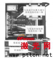 圖3 組網(wǎng)載荷與高速空間激光通信系統(tǒng)工作流程 在圖3中,組網(wǎng)載荷首先通過控制接口向高速空間激光通信系統(tǒng)發(fā)送預(yù)熱命令,指示高速空間激光通信系統(tǒng)進(jìn)行系統(tǒng)預(yù)熱,以節(jié)約組網(wǎng)載荷等應(yīng)用光學(xué)胡鶴飛等高速空間激光通信系統(tǒng)在空天信息網(wǎng)中的應(yīng)用待時(shí)間。在高速空間激光通信系統(tǒng)進(jìn)行預(yù)熱時(shí),組網(wǎng)載荷通過低速控制鏈路與對(duì)方節(jié)點(diǎn)進(jìn)行相互身份認(rèn)證,并交換彼此位置信息。高速空間激光通信系統(tǒng)完成預(yù)熱后,通過控制接口向組網(wǎng)載荷進(jìn)行應(yīng)答,向組網(wǎng)載荷通知高速空間激光通信系統(tǒng)已完成預(yù)熱。組網(wǎng)載荷通過控制接口向高速空間激光通信系統(tǒng)發(fā)送捕獲命令,其中應(yīng)包含對(duì)方節(jié)點(diǎn)的位置信息和本站姿態(tài)信息等參數(shù)。高速空間激光通信系統(tǒng)的APT分系統(tǒng)開始進(jìn)行捕獲與跟蹤。APT分系統(tǒng)在完成精跟蹤過程并與對(duì)方節(jié)點(diǎn)的高速空間激光通信系統(tǒng)鎖定后,高速空間激光通信系統(tǒng)通過控制接口向組網(wǎng)載荷應(yīng)答,向組網(wǎng)載荷通知高速空間激光通信系統(tǒng)已進(jìn)入鏈路就緒狀態(tài),數(shù)據(jù)接口可以發(fā)送和接收數(shù)據(jù)。完成上述過程后,組網(wǎng)載荷通過高速空間激光通信系統(tǒng)的數(shù)據(jù)接口發(fā)送和接收數(shù)據(jù)。在發(fā)送和接收數(shù)據(jù)的過程中,組網(wǎng)載荷可以隨時(shí)通過高速空間激光通信系統(tǒng)的控制接口查詢鏈路信息。 圖4展示了可作為空天通信網(wǎng)絡(luò)節(jié)點(diǎn)組網(wǎng)載荷的原理樣機(jī)和其中與高速空間激光通信系統(tǒng)連接的接口板。