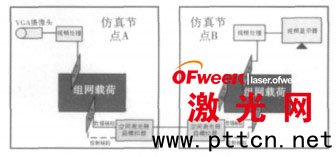 圖5 空天信息網(wǎng)絡(luò)通信協(xié)議模型 在協(xié)議模型中,組網(wǎng)載荷負(fù)責(zé)數(shù)據(jù)鏈路層以上的功能。低速控制鏈路部分有3層結(jié)構(gòu):物理層提供對(duì)等節(jié)點(diǎn)之間可靠的物理連接:數(shù)據(jù)控制層保證控制信息的可靠傳遞控制體層可包括多個(gè)控制實(shí)體。不同的控制實(shí)體具有不同的控制功能。本文所涉及到的控制實(shí)體包括認(rèn)證實(shí)體,管理實(shí)體和位置實(shí)體,分別負(fù)責(zé)認(rèn)證功能、網(wǎng)絡(luò)管理功能和位置功能。隨著空天信息網(wǎng)絡(luò)的研究深入,在控制層中可以隨著功能的擴(kuò)展添加更多的控制實(shí)體。 3、試驗(yàn) 基于此協(xié)議模型,我們進(jìn)行了協(xié)議棧開發(fā)并進(jìn)行了空間高速激光通信系統(tǒng)與組網(wǎng)載荷協(xié)同工作的數(shù)據(jù)傳輸試驗(yàn),試驗(yàn)的連接如圖6所示。