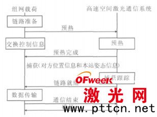 圖2 組網(wǎng)載荷與種通信載荷 在圖2中,組網(wǎng)載荷與高速空間激光通信系統(tǒng)之間有,2接口,分別為數(shù)據(jù)接口與控制接口。數(shù)據(jù)接口用于組網(wǎng)載荷與高速空間激光通信系統(tǒng)的通信分系統(tǒng)進(jìn)行通信數(shù)據(jù)傳輸;控制接口用于組網(wǎng)載荷與高速空間激光通信系統(tǒng)的APT分系統(tǒng)進(jìn)行控制信息傳輸,包括: 輸入對(duì)方節(jié)點(diǎn)位置姿態(tài)軌道等初始工作信息; 輸入控制命令; 監(jiān)視工作狀態(tài)。 當(dāng)組網(wǎng)載荷進(jìn)行空天通信網(wǎng)絡(luò)節(jié)點(diǎn)間組網(wǎng)和通信時(shí),需要先后驅(qū)動(dòng)2個(gè)通信載荷協(xié)調(diào)工作.工作的流程如圖3所示。