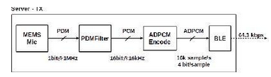 圖3:BlueVoice配置文件角色分配 2)音頻處理 BlueVoice的音頻處理目的是在根據(jù)應(yīng)用所選的接收端上,取得8kHz 或16 kHz的目標(biāo)音頻采樣。事實(shí)上,對(duì)于低功耗要求極其嚴(yán)格但是對(duì)音質(zhì)要求不高的應(yīng)用場(chǎng)景,例如,無(wú)需人耳聽(tīng)清楚的自動(dòng)語(yǔ)音識(shí)別服務(wù)輸入音頻,8kHz采樣率可能是一個(gè)不錯(cuò)的選擇。 使用自適應(yīng)差分脈沖碼調(diào)制算法壓縮低能耗藍(lán)牙音頻傳輸信號(hào),可使音頻信號(hào)適用于現(xiàn)有的數(shù)據(jù)傳輸速率,同時(shí)最大限度縮減射頻傳輸時(shí)間以及功耗。我們使用數(shù)字 MEMS麥克風(fēng)設(shè)計(jì)一個(gè)全數(shù)字解決方案,尺寸和音質(zhì)等特性使其適用于無(wú)線(xiàn)傳感器設(shè)備。圖4所示是16 kHz采樣率的完整語(yǔ)音處理鏈。該解決方案首先采集數(shù)字MEMS麥克風(fēng)生成的1 MHz 的1位脈沖密度調(diào)制(PDM)信號(hào),并將其轉(zhuǎn)換成16 kHz 的16位脈沖編碼調(diào)制(PCM)采樣,然后以16000個(gè)采樣/秒的采樣率,再將其壓縮成4位ADPCM采樣信號(hào),并準(zhǔn)備發(fā)送。 此外,以較低的頻率發(fā)送邊信息同步數(shù)據(jù)集合,所需帶寬是64 kbps音頻數(shù)據(jù)與300 bps同步信息數(shù)據(jù)之和,總計(jì)64.3 kbps。對(duì)于8kHz采樣率,最終ADPCM采樣率是8000個(gè)采樣/秒,導(dǎo)致31.3 kbps帶寬需求,包括邊信息。下面章節(jié)深入介紹上述模塊。