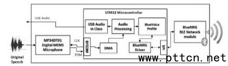 圖5:BlueVoice數(shù)據(jù)分組機(jī)制 C. 在實(shí)際硬件上實(shí)現(xiàn)應(yīng)用 為了在支持低能耗藍(lán)牙通信的不是十分復(fù)雜的實(shí)際硬件無(wú)線(xiàn)傳感器網(wǎng)絡(luò)平臺(tái)上評(píng)估BlueVoice的可行性,我們?cè)趯?shí)際硬件設(shè)備上實(shí)現(xiàn)了第三章B部分所描述的應(yīng)用軟件的全部功能。所選硬件平臺(tái)是意法半導(dǎo)體的STM32 Nucleo L476開(kāi)發(fā)板[5],這是一個(gè)基于STM32L476 80 MHz 32位ARM Cortex-M4微控制器的開(kāi)放式開(kāi)發(fā)平臺(tái)。我們選擇STM32 Nucleo開(kāi)發(fā)板的原因是,板載微控制器的性能高于普通無(wú)線(xiàn)傳感器網(wǎng)絡(luò)平臺(tái),同時(shí)還具備很高的靈活性和多功能性。該開(kāi)發(fā)板配備很多接口和擴(kuò)展排針,插接專(zhuān)用擴(kuò)展板擴(kuò)大板子功能簡(jiǎn)單容易,方便設(shè)計(jì)人員研究、開(kāi)發(fā)和驗(yàn)證新創(chuàng)意。特別值得一提的是,STM32L4微控制器具有市場(chǎng)領(lǐng)先的低功耗特性,其內(nèi)置數(shù)字濾波器配合Sigma-Delta調(diào)制器(DFSDM)外設(shè),可實(shí)現(xiàn)圖4的PDM至PCM的格式轉(zhuǎn)換,這些特性使其特別適合BlueVoice應(yīng)用。通過(guò)在STM32Nucleo開(kāi)發(fā)板上接插一塊低能耗藍(lán)牙連接板和一塊麥克風(fēng)擴(kuò)展板,BlueVoice中央模塊和周邊模塊可以組成一個(gè)基于 STM32Nucleo的對(duì)稱(chēng)硬件配置,展示一個(gè)半雙工通信通道。低能耗藍(lán)牙連接板基于意法半導(dǎo)體的BlueNRG [6],BlueNRG是一個(gè)超低功耗的低能耗藍(lán)牙單模網(wǎng)絡(luò)處理器,兼容藍(lán)牙規(guī)范4.0版,可設(shè)為主設(shè)備和從設(shè)備模式,當(dāng)?shù)湍芎乃{(lán)牙協(xié)議棧啟動(dòng)時(shí),數(shù)據(jù)傳輸最大電流8.2 mA,可降至1.7 uA。附加的麥克風(fēng)擴(kuò)展板用于采集語(yǔ)音信號(hào),基于意法半導(dǎo)體的MP34DT01 [7]數(shù)字萬(wàn)向MEMS 麥克風(fēng),聲學(xué)過(guò)載點(diǎn)120 dBSPL, 信噪比63 dB,靈敏度-26 dBFS。MP34DT01采用一個(gè)容式傳感器和一個(gè)內(nèi)置sigma-delta調(diào)制器和噪聲修整機(jī)制的集成電路,提供1-3.25 MHz的PDM輸出。 圖6是實(shí)際硬件設(shè)備的框圖:STM32微控制器通過(guò)與外設(shè)模塊DMA相連的DFSDM模塊采集麥克風(fēng)的PDM采樣輸出,同時(shí)通過(guò)一套專(zhuān)用應(yīng)用程序界面 (API)和串行外設(shè)接口(SPI)與BlueNRG模塊通信,對(duì)于中央模塊和周邊模塊,模塊化架構(gòu)是對(duì)稱(chēng)的?驁D中還有一個(gè)USB音頻接口,用于向PC 機(jī)提供重構(gòu)的音頻信號(hào)。圖7是硬件設(shè)備的實(shí)際原型。 D. 性能 我們用第三章C部分描述的實(shí)際系統(tǒng)作為實(shí)驗(yàn)平臺(tái),評(píng)估BlueVoice應(yīng)用的功能、存儲(chǔ)器占用、性能需求和ASR識(shí)別率。特別是考慮到現(xiàn)場(chǎng)部署一系列微型無(wú)線(xiàn)麥克風(fēng)模塊的應(yīng)用場(chǎng)景和低能耗藍(lán)牙本身的非對(duì)稱(chēng)性(從設(shè)備-外設(shè)模塊必須尺寸緊湊且功耗極低),本章討論的性能評(píng)估主要討論 8 kHz和16 kHz兩種配置的從設(shè)備-外設(shè)模塊的功耗、存儲(chǔ)器占用和性能震求。此外,在接收端測(cè)量的ASR性能是另一個(gè)性能評(píng)估指標(biāo),實(shí)際上,該參數(shù)可能是語(yǔ)音通信的一個(gè)重要的音質(zhì)指標(biāo),對(duì)于新興的聲控應(yīng)用(遙控器、物聯(lián)網(wǎng)產(chǎn)品)具有重要意義。