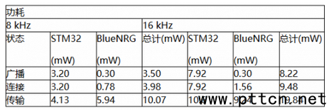 表I:BLUEVOICE功耗 按照低能耗藍(lán)牙標(biāo)準(zhǔn),在兩個(gè)節(jié)點(diǎn)之間建立連接前,從設(shè)備是處于廣播模式,而主設(shè)備則是進(jìn)入掃描模式。當(dāng)主設(shè)備收到廣播數(shù)據(jù)包,發(fā)現(xiàn)從設(shè)備存在時(shí),就立即建立連接。在BlueVoice解決方案中,考慮到一個(gè)外設(shè)模塊對(duì)中央模塊的通信,外設(shè)節(jié)點(diǎn)是發(fā)送器(服務(wù)器),而中央節(jié)點(diǎn)是接收器(客戶(hù)機(jī)):服務(wù)器以固定周期向客戶(hù)機(jī)發(fā)送通知。對(duì)于8 kHz配置中,在廣播階段,發(fā)送器外設(shè)模塊(STM32 + BlueNRG)總平均功耗極低,只有3.50mW,當(dāng)建立連接時(shí),功耗是3.98 mW。對(duì)于16 kHz配置,廣播階段功耗是8.22 mW,而連接階段是9.48 mW。這里應(yīng)著重指出的是,連接階段的功耗與連接間隔選擇關(guān)系密切,這也是8 kHz和16 kHz配置(分別是20 ms和10 ms)的主要區(qū)別。在這兩情況中,連接間隔設(shè)為接近標(biāo)準(zhǔn)規(guī)定的最小值(7.5 ms),以確保傳輸延遲最小。一旦連接建立, BlueVoice應(yīng)用立即進(jìn)入傳輸狀態(tài),8 kHz配置的平均功耗是10.07 mW,16 kHz配置的平均功耗是19.84 mW,因此,基于STM32 + BlueNRG的物聯(lián)網(wǎng)節(jié)點(diǎn),假設(shè)電池容量是200 mAh,在連續(xù)傳送數(shù)據(jù)流時(shí),兩種配置的理論續(xù)航時(shí)間分別是約65小時(shí)和33小時(shí)。這些功耗值表明BlueVoice方法的適用于以低能耗藍(lán)牙為載體的音頻流,特別是8 kHz配置,可大幅降低功耗。 除分析功耗外,通過(guò)考慮存儲(chǔ)器占用情況,我們還評(píng)估了應(yīng)用的可行性。如表II所示,BlueVoice應(yīng)用軟件兩種配置占用閃存空間相同(21.85 kB),但是,8 kHz配置占用13.32 kB的RAM空間,而16 kHz配置只占用7.86 kB的RAM空間。兩種配置占用RAM空間不同的原因是,為降低該解決方案的額外開(kāi)銷(xiāo)和功耗,8 kHz和16 kHz分別每20 ms 和10 ms執(zhí)行音頻處理步驟(PDM轉(zhuǎn)PCM和ADPCM壓縮),從而導(dǎo)致8 kHz配置在兩個(gè)連續(xù)步驟之間存儲(chǔ)的數(shù)據(jù)變大。在這兩種情況中,這些數(shù)值十分符合資源受限的系統(tǒng)要求。