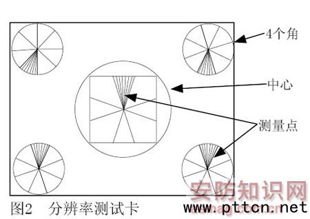 式中,m為水平方向的像素?cái)?shù),V是畫面的垂直高度,H為水平長(zhǎng)度,V/H也叫做光柵高寬比。一般V/H=3/4=0.75,所以(9)式可寫成 RH =3/4×m=0.75m (10) 該式即為黑白攝像機(jī)的清晰度公式。但現(xiàn)實(shí)上因?yàn)楣鈱W(xué)因素會(huì)低于這個(gè)理論值,如為抑制因條紋圖案接近間距發(fā)生的水波紋,所使用的光學(xué)低通濾波器及鏡頭的分辨率等。 對(duì)單板彩色CCD攝像機(jī),因彩色濾光片效果,其分辨率低于相同像素?cái)?shù)的黑白攝像機(jī),其清晰度的表示式為 RH = 0.75m×α (11) 式中,α為因彩色濾光片排列所改變的經(jīng)驗(yàn)值:對(duì)原色直線排列條紋濾光片,α=0.53?0.57;對(duì)補(bǔ)色方塊色差線順序?yàn)V光片,α=0.8?0.85。彩色CCD攝像機(jī)多使用后者。 因此,對(duì)像素?cái)?shù)為500(H)×582(V)的低解析攝像機(jī)來說,其黑白機(jī)的水平清晰度RH = 0.75×500 = 375TVL,所以對(duì)分辨率無特殊優(yōu)化處理等功能的一般攝像機(jī)來說,這種像素?cái)?shù)不可能有420TVL,至于彩色攝像機(jī)就更不可能稱420TVL了,而最好也只能是375×0.83=310TVL;至于752(H)×582(V)的高解攝像機(jī),黑白機(jī)的水平清晰度為0.75×752=564TVL,不可能為600TVL,而彩色機(jī)也只有460TVL。所以,不是你說得越高越好,而是要有科學(xué)依據(jù)的。 分辨率的測(cè)試 通常,分辨率的測(cè)試是用安裝有成像質(zhì)量好的鏡頭的攝像機(jī),去拍攝圖2所示的分辨率測(cè)試卡,并通過波形監(jiān)視器用人眼來讀取所能分辨的最大線數(shù)。其具體方法如下:
