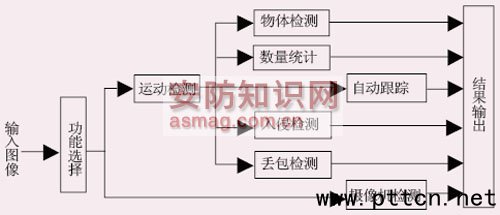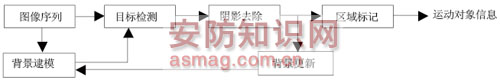 圖2 智能視頻監(jiān)控系統(tǒng)的工作流程 DSP端接收到一幀圖像后,利用Blackfin 561 DSP的兩個(gè)核完成智能視頻監(jiān)控處理和視頻編碼壓縮處理。智能視頻監(jiān)控處理部分,利用Blackfin 561 DSP的核A進(jìn)行,它首先通過(guò)UART通信模塊獲得PC端監(jiān)控功能選擇模塊的當(dāng)前功能,以及這一功能的相應(yīng)參數(shù),然后根據(jù)相應(yīng)的功能調(diào)用監(jiān)控功能模塊中對(duì)應(yīng)的監(jiān)控函數(shù)進(jìn)行處理;最后再利用UART通信模塊將處理的結(jié)果傳送到PC端顯示。視頻編碼壓縮處理部分,使用Blackfin 561 DSP的核B進(jìn)行,利用由ADI公司提供的H.264編碼函數(shù)和USB驅(qū)動(dòng)函數(shù)實(shí)現(xiàn),這里就不贅述了。 PC端進(jìn)行不同監(jiān)控功能的切換或調(diào)整功能參數(shù),在下一幀輸入圖像中將進(jìn)行監(jiān)控功能的切換和參數(shù)的調(diào)整。 客戶端軟件 客戶端軟件是用戶實(shí)現(xiàn)DSP監(jiān)控操作的平臺(tái),主要由監(jiān)控軟件界面、監(jiān)控功能選擇模塊、驅(qū)動(dòng)函數(shù)模塊組成。 監(jiān)控軟件界面是監(jiān)控系統(tǒng)和用戶進(jìn)行信息交互的平臺(tái),它整合了各個(gè)監(jiān)控功能模塊,用戶通過(guò)它完成各個(gè)監(jiān)控功能模塊的調(diào)用、參數(shù)的選擇、結(jié)果的顯示等。 PC監(jiān)控功能選擇模塊完成對(duì)底層DSP監(jiān)控功能的調(diào)用,從而實(shí)現(xiàn)用戶需要的相應(yīng)的監(jiān)控功能。 驅(qū)動(dòng)函數(shù)模塊包括UART驅(qū)動(dòng)和USB驅(qū)動(dòng)。UART驅(qū)動(dòng)的作用是實(shí)現(xiàn)上層PC的監(jiān)控服務(wù)軟件和底層DSP的監(jiān)控功能程序之間的UART接口通信;USB驅(qū)動(dòng)的作用是通過(guò)USB接口接收底層DSP發(fā)送的壓縮碼流。 DSP端監(jiān)控功能軟件 DSP監(jiān)控功能軟件是整個(gè)監(jiān)控功能實(shí)現(xiàn)的核心,由監(jiān)控功能模塊、H.264視頻壓縮模塊和UART通信模塊組成。 DSP監(jiān)控功能模塊經(jīng)PC端監(jiān)控功能選擇模塊進(jìn)行調(diào)用,直接負(fù)責(zé)完成相應(yīng)的監(jiān)控功能,并將結(jié)果傳輸?shù)絇C端。 H.264視頻壓縮模塊負(fù)責(zé)將輸入視頻圖像進(jìn)行H.264壓縮,并使用USB接口將壓縮后的視頻圖像傳輸?shù)絇C端。 UART通信模塊負(fù)責(zé)利用協(xié)議實(shí)現(xiàn)和PC端的通信。 1、DSP監(jiān)控功能模塊 本文所設(shè)計(jì)的智能視頻監(jiān)控系統(tǒng)需要實(shí)現(xiàn)8個(gè)不同的智能視頻監(jiān)控功能。根據(jù)監(jiān)控功能的不同性質(zhì)和處理手段,主要分為:物體檢測(cè)與數(shù)量統(tǒng)計(jì)、自動(dòng)跟蹤、入侵和遺留物體檢測(cè)、攝像機(jī)模糊、遮擋及非法移動(dòng)等4類不同功能。本模塊通過(guò)從PC端功能選擇模塊獲取監(jiān)控信息,選擇單一視頻監(jiān)控功能進(jìn)行處理。監(jiān)控功能模塊流程如圖3所示。 圖3 監(jiān)控功能模塊流程 監(jiān)控功能模塊中大部分功能首先都需要進(jìn)行相同的前期處理過(guò)程-運(yùn)動(dòng)對(duì)象的提取。本系統(tǒng)運(yùn)動(dòng)對(duì)象的提取主要包括背景建模和連通域標(biāo)記兩個(gè)部分,其主要流程如圖4所示。 圖4 運(yùn)動(dòng)對(duì)象提取 · 物體檢測(cè):物體檢測(cè)需要根據(jù)運(yùn)動(dòng)檢測(cè)的結(jié)果判斷當(dāng)前運(yùn)動(dòng)物體所屬的類別,如人體、四足動(dòng)物、四輪機(jī)動(dòng)車、非機(jī)動(dòng)車等。其使用高斯背景模型進(jìn)行運(yùn)動(dòng)檢測(cè),提取目標(biāo)的形狀特征,并對(duì)它們進(jìn)行分類,最后輸出運(yùn)動(dòng)物體的位置、類別; · 數(shù)量統(tǒng)計(jì):數(shù)量統(tǒng)計(jì)需要在物體檢測(cè)的基礎(chǔ)上,統(tǒng)計(jì)各類物體或一類物體的數(shù)目,在統(tǒng)計(jì)過(guò)程中,還需要區(qū)分個(gè)體和群體。其在分類的基礎(chǔ)上,使用計(jì)數(shù)器統(tǒng)計(jì)當(dāng)前幀中各種目標(biāo)的數(shù)量。最后輸出各類物體數(shù)目,如個(gè)體數(shù)目、群體數(shù)目; · 入侵檢測(cè):入侵檢測(cè)需要判斷場(chǎng)景中運(yùn)動(dòng)物體是否進(jìn)入某一固定區(qū)域。其在運(yùn)動(dòng)檢測(cè)的基礎(chǔ)上,判斷目標(biāo)的位置與標(biāo)定的”禁入”位置的相對(duì)關(guān)系,以實(shí)現(xiàn)入侵檢測(cè),最后輸出入侵物體位置和類別; · 遺留物體檢測(cè):遺留物體檢測(cè)主要是檢測(cè)固定區(qū)域內(nèi)箱包類物體的非法滯留問(wèn)題。具體說(shuō),主要是檢測(cè)行人將箱包等遺留到場(chǎng)景中的情況(重點(diǎn)是為了排除爆炸物和危禁品)。當(dāng)然,也包括將場(chǎng)景中原有物體拿走的情況。通過(guò)判斷物體在監(jiān)控場(chǎng)景中出現(xiàn)的時(shí)間的長(zhǎng)短,來(lái)判斷是否為遺留物體,輸出遺留物體的位置及大小;