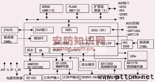 主頁(yè)(http://www.130131.com):基于DSP智能視頻監(jiān)控系統(tǒng)的軟硬件設(shè)計(jì) 【中國(guó)集群通信網(wǎng)】硬件設(shè)計(jì) 由于本系統(tǒng)使用Blackfin 561 DSP進(jìn)行開(kāi)發(fā),因而整個(gè)系統(tǒng)可采用一塊BF561 EZ-KIT Lite評(píng)估板、一臺(tái)CCD攝像機(jī)、一臺(tái)PC機(jī)和一個(gè)Blackfin USB-LAN EZ-Extender卡。 BF561 EZ-KIT Lite評(píng)估板主要用來(lái)實(shí)現(xiàn)智能處理算法以及對(duì)視頻流的壓縮編碼功能。因?yàn)樵贐F561 EZ-KIT Lite評(píng)估板上包括有:視頻處理芯片ADSP BF561;外部總線接口單元(EBIU)、SPORT接口、SPI接口、PPI接口、UART接口、JTAG仿真接口等。視頻A/D模塊采用ADV7183視頻解碼芯片。BF561 EZ-KIT Lite評(píng)估板結(jié)構(gòu)如圖1所示。 圖1 BF561 EZ-KIT Lite評(píng)估板結(jié)構(gòu) Blackfin USB-LAN EZ-Extender卡 Blackfin USB-LAN EZ-Extender卡可連接USB設(shè)備,并通過(guò)網(wǎng)絡(luò)傳輸已壓縮的視頻數(shù)據(jù)到PC客戶端。因?yàn)樵贐lackfin USB-LAN EZ-Extender卡上包含有一個(gè)USB 2.0接口;一個(gè)10/100自適應(yīng)網(wǎng)口等。 CCD攝像機(jī) 這一臺(tái)CCD攝像機(jī),主要用來(lái)采集視頻。 PC客戶端 該P(yáng)C客戶端主要用來(lái)接收壓縮視頻,配置和控制終端控制系統(tǒng)工作方式,并且能夠存儲(chǔ)系統(tǒng)的輸出。 軟件設(shè)計(jì) 基于Blackfin 561 DSP的智能視頻監(jiān)控系統(tǒng)軟件部分,由上層PC監(jiān)控服務(wù)軟件和底層DSP監(jiān)控功能軟件兩部分組成。上層PC部分主要進(jìn)行監(jiān)控功能選擇和監(jiān)控結(jié)果的顯示,底層DSP部分主要進(jìn)行智能監(jiān)控和壓縮編碼的算法實(shí)現(xiàn)。視頻監(jiān)控系統(tǒng)通過(guò)使用UART和USB接口作為聯(lián)系PC和DSP的通道,以實(shí)現(xiàn)數(shù)據(jù)的交換。其中,使用異步串口(UART)作為監(jiān)控系統(tǒng)與PC端監(jiān)控軟件的通信接口,完成底層監(jiān)控程序和PC端監(jiān)控服務(wù)軟件之間的通信;使用USB控制器作為壓縮碼流的數(shù)據(jù)傳輸接口,完成壓縮碼流向PC端的輸送任務(wù)。 智能視頻監(jiān)控系統(tǒng)同時(shí)使用Blackfin 561 DSP的兩個(gè)核進(jìn)行處理,通過(guò)PC服務(wù)軟件和DSP端監(jiān)控功能軟件協(xié)同工作,其主要工作流程如圖2所示。