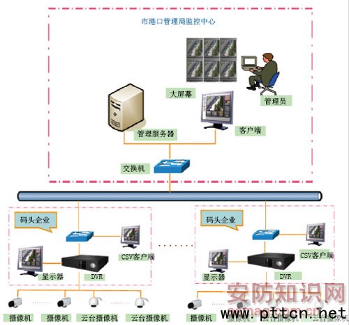 圖1 系統(tǒng)結(jié)構(gòu)圖 【相關(guān)閱讀:淺析某市港口網(wǎng)絡(luò)視頻監(jiān)控應(yīng)用(下篇)】 分布設(shè)計(jì) 1、碼頭企業(yè)監(jiān)控 前端攝像機(jī)的視頻、音頻信號(hào)直接輸入到DVR,實(shí)現(xiàn)在港口企業(yè)內(nèi)部視頻的實(shí)時(shí)瀏覽及本地存儲(chǔ),DVR完成模擬信號(hào)數(shù)字化后通過(guò)網(wǎng)絡(luò)將視頻信號(hào)傳到管理局視頻監(jiān)控中心,同時(shí)在企業(yè)安裝客戶端的機(jī)器也可以通過(guò)訪問(wèn)位于管理局視頻監(jiān)控中心的管理服務(wù)器實(shí)現(xiàn)對(duì)權(quán)限許可范圍內(nèi)圖像的瀏覽及操作,如圖2所示。