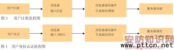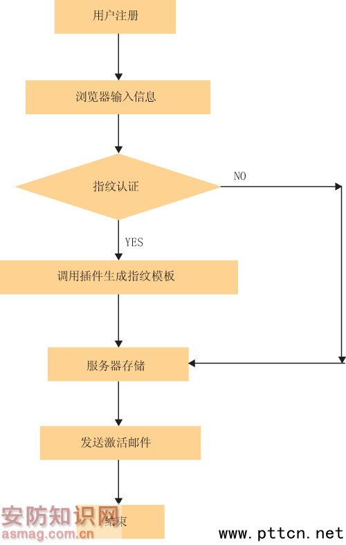 對于用戶的充值過程,目前尚不具備指紋技術(shù)應(yīng)用的基礎(chǔ)。對于用戶登錄和支付過程,由于指紋特征的隨機(jī)性(同一枚手指多次采集得到的指紋特征都不盡相同)和可匹配性(雖然同一枚手指多次采集得到的指紋特征都不相同,但可以通過算法來驗(yàn)證是不是同一指紋),指紋特征可以認(rèn)為是隨機(jī)密碼,完全可以代替原有的登錄密碼和支付密碼。 與原注冊流程圖(見圖5)對比發(fā)現(xiàn),在不改變原有注冊方式的基礎(chǔ)上,增加瀏覽器調(diào)用指紋插件,登記用戶的指紋模板,為指紋身份認(rèn)證作準(zhǔn)備。沒有登記指紋的用戶使用密碼驗(yàn)證身份,保證與原系統(tǒng)的兼容。