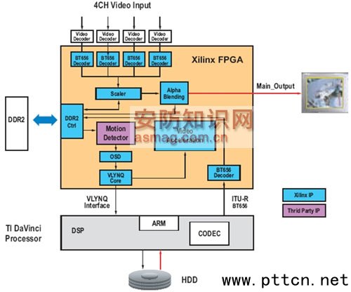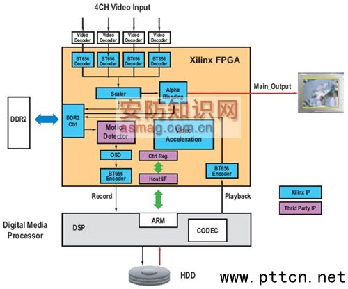 主頁(http://www.130131.com):視頻監(jiān)控系統(tǒng)采用FPGA實現(xiàn)視頻處理 【中國集群通信網(wǎng)】視頻監(jiān)控系統(tǒng)在火車站、機場、銀行、娛場、樂商場甚至家庭的安保方面都是一種關(guān)鍵設(shè)備。隨著安全風(fēng)險的日益增大,在各種應(yīng)用場合對已發(fā)事件進行視頻監(jiān)控和記錄的需求都在逐步上升,這就要求視頻監(jiān)控系統(tǒng)的新結(jié)構(gòu)必須具備可擴展性,以便為日益多樣化的視頻監(jiān)控需求提供高性價比的解決方案。在視頻監(jiān)控系統(tǒng)結(jié)構(gòu)所面臨的眾多挑戰(zhàn)中,上市時間壓力、CODEC新標(biāo)準(zhǔn)的出臺和需求范圍的不斷擴大(包括高級目標(biāo)檢測、運動檢測、目標(biāo)跟蹤和目標(biāo)跟蹤功能) 還只是其中的一小部分。要應(yīng)對這些挑戰(zhàn),視頻監(jiān)控系統(tǒng)的實現(xiàn)就必須能根據(jù)不同性能要求而進行相應(yīng)調(diào)整。 Xilinx的 FPGA產(chǎn)品是各種視頻監(jiān)控系統(tǒng)理想的解決方案,不論它是低端系統(tǒng)還是高端系統(tǒng),是獨立系統(tǒng)還是PC擴展卡系統(tǒng)。 視頻監(jiān)控與DVR系統(tǒng) 高級數(shù)字視頻壓縮技術(shù)在視頻監(jiān)控系統(tǒng)的數(shù)字錄像機(DVR)中正得到快速普及。隨著大多數(shù)DVR制造商從MPEG4轉(zhuǎn)為采用H.264 高清(HD) CODEC,對提高分辨率和壓縮率的要求也變得更急切。專用標(biāo)準(zhǔn)產(chǎn)品(ASSP) 比較適合量大的應(yīng)用,但缺乏靈活性,而且開發(fā)時間過長,成本也高。大多數(shù)高級數(shù)字媒體處理器連實現(xiàn)H.264 HD解碼都比較困難,何況H.264 HD編碼比解碼還復(fù)雜得多。因此,要滿足H.264 HD的性能要求,最佳方案就是采用一塊FPGA加一塊外部DSP或數(shù)字媒體處理器。 采用低成本的Xilinx FPGA產(chǎn)品還能進一步提供運動檢測、視頻量化、色域轉(zhuǎn)換(color-space conversion)、硬盤接口、DDR2存儲器接口等功能,以及將兩個27MHz的 ITU-R BT656數(shù)據(jù)流通過時分復(fù)用合為一路54MHz的數(shù)據(jù)流,同時為DSP處理器提供視頻加速。將兩個ITU-R BT656數(shù)據(jù)流復(fù)用為一個之后,系統(tǒng)只需單通道的視頻端口就能獨立傳送整個雙通道的視頻數(shù)據(jù)。這種實現(xiàn)方式在連接只有一個ITU-R BT656視頻輸入端口的數(shù)字媒體處理器時非常實用。圖1所示就是上述推薦系統(tǒng)的結(jié)構(gòu)框圖。 ![]() 圖1:利用FPGA和數(shù)字媒體處理器搭建的視頻監(jiān)控系統(tǒng)。 對采用只有單個ITU-R BT656視頻輸入端口的TI達芬奇處理器的DVR設(shè)計而言,更高效 的實現(xiàn)方案是在數(shù)據(jù)流送入達芬奇處理器之前,將兩個以上的ITU-R BT656數(shù)據(jù)流時分復(fù)用為單個VLYNQ數(shù)據(jù)流。這種方案減少了用于視頻數(shù)據(jù)流傳輸?shù)腎/O管腳,因而縮小了器件的封裝,降低了系統(tǒng)成本。圖2所示為該設(shè)計的框圖。 ![]() 圖2:利用FPGA和達芬奇處理器搭建的視頻監(jiān)控系統(tǒng)。 PC擴展卡形式的DVR系統(tǒng) PCI總線在PC機上已成功應(yīng)用了10余年。但今天的PC擴展卡DVR系統(tǒng)所要求的帶寬已遠遠超出了PCI總線所能提供的極限。 未壓縮的視頻(在除去空白幀之后)數(shù)據(jù)率約為165 Mbps。于是,當(dāng)PCI總帶寬為1 Gbps時,一條PCI總線上最多可同時連接6個發(fā)送未壓縮視頻的捕捉或回放設(shè)備。為降低總線帶寬的占用,可以在擴展卡上采用一塊MPEG4或 CODEC芯片組,但這樣會提高成本,而且可選器件也局限于現(xiàn)有的MPEG4芯片組。 PCI Express (PCIe)技術(shù)在流量上有了很大提高。PCI Express可以細分為多個通道,每個通道在出和入上均包含一對差分對,每對差分對支持2 Gbps的數(shù)據(jù)流量。一塊主板上的每個PCIe插槽都有自己的通道,這些通道是不與其他插槽共享的。每個插槽可配置為16通道(即x16)、8通道(x8) 、4 通道 (x4)或 1通道 (x1)。因此,每塊采用PCIe總線的擴展卡可提供的數(shù)據(jù)流量從2 Gbps(配置為x1通道時)到32 Gbps(配置為x16通道時)。PCIe所支持的高數(shù)據(jù)流量讓我們不再只局限于每卡連接6通道的未壓縮視頻。 (中國集群通信網(wǎng) | 責(zé)任編輯:陳曉亮) |