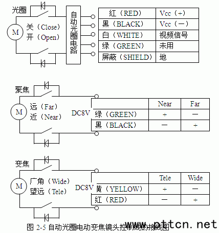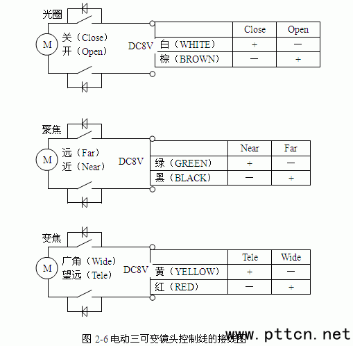 ![]() F、電動三可變鏡頭 此種鏡頭與前述電動兩可變鏡頭結(jié)構(gòu)相差不多,只是將對光圈調(diào)整電動機的控制由自動控制方式改為由控制器來手動控制,因此它也包含了3個微型電動機,引出一組6芯控制線與云臺鏡頭控制器及解碼器相連。常見的有6倍、10倍和12倍等幾種規(guī)格。圖2-6為該鏡頭控制線的接線圖。 需要說明的是,變焦鏡頭的“倍率”與焦距是兩個不同的概念,有些人往往混淆兩者的含義,認為倍率越高則看得越遠。其實,倍率是變焦鏡頭的最長焦距與最短焦距之比,是一個相對值。例如,同樣是6倍鏡頭,市面上常見的就有6~36mm、7~42 mm、8~48 mm和8. 5~51 mm等多種不同廠家的不同品種,其中8. 5~51 mm鏡頭的遠視特性顯然比6~36mm鏡頭的遠視特性要好,但它的近視(廣角)特性卻不如6~36mm鏡頭好。