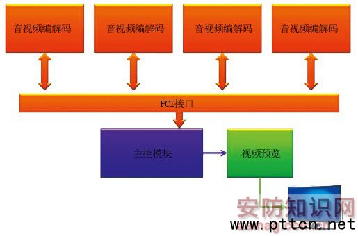 圖2 HVR的模擬和數(shù)字的預覽及錄像通道 從圖2可以看出,HVR確實是DVR和NVR的綜合體,圖1左邊的模擬通道是DVR的主通道,而右邊的數(shù)字通道則是NVR的主通道。 HVR架構(gòu)上的難題 對比NVR,HVR增加了模擬視頻接入和編碼的功能;而相對DVR,HVR強化了音視頻解碼和數(shù)字接入部分功能,功能的豐富帶來的是系統(tǒng)復雜性的增加。如果要構(gòu)建一個模擬16路D1+數(shù)字16路D1的HVR,現(xiàn)有的單片芯片基本上都沒有如此強大的編解碼能力,那就要以處理芯片的級聯(lián)來實現(xiàn)。傳統(tǒng)的芯片級聯(lián)的方式通常通過PCI或者PCIE接口來實現(xiàn),而大多媒體處理芯片將編碼和解碼的功能做在一起,如下圖3。而HVR遇到的困惑就是:視頻預覽模塊掛在主控模塊上,所有解碼后的原始數(shù)據(jù)都從PCI給主控,再由主控輸出到監(jiān)視器,這樣給主控模塊造成了很大的壓力。