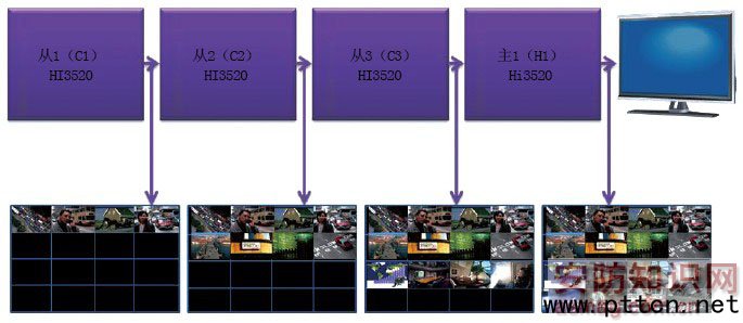 圖4 視頻級聯(lián)模式的視頻預覽回放級聯(lián)模式 該視頻級聯(lián)模式是一個多核處理器,包括一個600M Hz的ARM11和一個300MHz ARM9,以及硬件加速的H.264編碼解碼器,可以支持到8個D1的H.264的實時編碼或者解碼。 視頻級聯(lián)模式內(nèi)部的ARM11可以做系統(tǒng)的主控制器,ARM9用來控制H.264的流程和音頻處理,一般不供外部使用?梢杂4片3520構(gòu)成一個16 D1模擬接入(16 D1編碼)和16 D1的網(wǎng)絡(luò)接入(16 D1解碼)的HVR系統(tǒng)(圖4):16路模擬通道首先經(jīng)過4片TW2866做模擬/數(shù)字變換,然后用byte interleaving模式合成在2路BT.656鏈路中,傳輸給Hi3520,Hi3520剩下的2個BT.656接口并接成1個16 bit的BT.1120的接口,用來做視頻串聯(lián),將4片Hi3520首尾串接起來,組成視頻預覽回放的串聯(lián)通路。 先計算一下PCI的負荷:4片Hi3520共享一個PCI總線,主控H1的PCI設(shè)定為主模式,而其他3片Hi3520的PCI則為從模式,通過PCI總線,主控芯片H1可以對從設(shè)備C1?C3進行軟件加載,可以發(fā)送控制命令和接收音視頻碼流,如果以每個D1, 2M bit的碼流來計算,PCI的負荷為24M bit(3M byte),如果加上存儲和回放(通過PCI來擴充PCI轉(zhuǎn)SATA橋),共88M bit(11M byte)的負荷,只有1路D1的原始視頻的1半,這就意味著程序員不必再挖空心思為降低PCI載荷而浪費寶貴的時間。 在DVR和HVR系統(tǒng)中,對錄像和預覽回放的處理方式是不一樣的,比如全D1的錄像機,它的錄像通道就是D1大小,是不變的;而預覽和回放不一樣,需要根據(jù)用戶的設(shè)定來改變,比如在一個1920×1080的顯示器上,用戶可以將屏幕劃分成多個子窗口,一般有36、25、16、9、8、4、1等劃分方法,也稱之為layout方式。首先,主控芯片H1根據(jù)客戶規(guī)定的layout方式發(fā)給每片處理器。每片處理器將采集或者解碼得到的視頻數(shù)據(jù)進行縮放,再放到規(guī)定的layout子窗口內(nèi)。然后,將合成的視頻從級聯(lián)輸出口輸出,隨著視頻從C1傳到C2、C3,最后傳到H1。H1貼好自己的layout子窗口后,整個預覽視頻就完整了,通過MDIN340這顆HDMI驅(qū)動器,將視頻完整地顯示在監(jiān)視器上,如圖5所示。從HVR系統(tǒng)的主要使用方式來分析一下數(shù)據(jù)流向,探究該視頻級聯(lián)模式的視頻預覽回放級聯(lián)模式的具體運作。