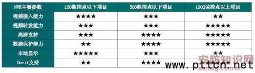 主頁(yè)(http://www.130131.com):大安防環(huán)境下的NVR應(yīng)用(2) · 可以很清晰掌控監(jiān)控點(diǎn)數(shù)量、監(jiān)控錄像畫(huà)質(zhì)的需求、監(jiān)控錄像的存儲(chǔ)時(shí)長(zhǎng)、數(shù)據(jù)傳輸用什么方式等,方便往里面填充合適的設(shè)備,反過(guò)來(lái)可以驗(yàn)證方案的合理性; · 不會(huì)被多個(gè)廠商誤導(dǎo)而失去了最初的目標(biāo)。有句話說(shuō)的好,適合自己的才是最好的,相信大部分項(xiàng)目還是以滿足實(shí)際需求為目的; · 因?yàn)橛辛朔桨傅恼w框架,必然會(huì)出現(xiàn)多種針對(duì)該方案的解決方式。具體到NVR產(chǎn)品,就有多種選擇:在滿足相同容量的基礎(chǔ)上更多路攝像機(jī)接入的產(chǎn)品看似有優(yōu)勢(shì),其實(shí)不然,還必須綜合考慮存儲(chǔ)時(shí)間這個(gè)因素,然后計(jì)算并衡量準(zhǔn)備采用幾臺(tái)設(shè)備來(lái)實(shí)現(xiàn)需求,當(dāng)存儲(chǔ)容量固定后,會(huì)發(fā)現(xiàn)更多路接入能力的設(shè)備其實(shí)并不能發(fā)揮它的能力,因?yàn)榇鎯?chǔ)時(shí)間不夠了,不得不再購(gòu)買(mǎi)一臺(tái),這時(shí)候接入能力就沒(méi)有這么重要的,換句話說(shuō),這個(gè)時(shí)候更多的接入能力對(duì)項(xiàng)目需求來(lái)說(shuō)是浪費(fèi),而需要付出的是金錢(qián),所以還是強(qiáng)調(diào),適合的才是最好; 除了圍繞項(xiàng)目選擇產(chǎn)品的原則以外,具體到設(shè)備本身,用戶面對(duì)市場(chǎng)上如此多的品牌及產(chǎn)品,眼花繚亂的同時(shí),將用什么方式、方法來(lái)選擇出合適自己的產(chǎn)品呢? 對(duì)NVR產(chǎn)品,將用表格的方式,針對(duì)不同規(guī)模的項(xiàng)目,列舉出重要指標(biāo)在這些項(xiàng)目中的重要程度,見(jiàn)表1(5星為最重要,1星為可忽略)。 表1 不同項(xiàng)目NVR的指標(biāo)重要性