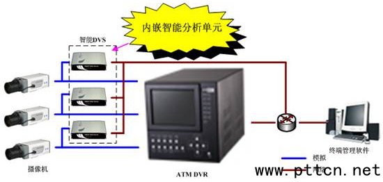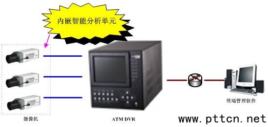 方式3:通過對(duì)ATM監(jiān)控系統(tǒng)中的攝像機(jī)加載智能視頻處理模塊,形成智能視頻處理攝像機(jī)。這樣在不改變傳統(tǒng)ATM監(jiān)控系統(tǒng)連接方式的前提下,智能視頻處理攝像機(jī)能夠?qū)ζ洳东@的視頻數(shù)據(jù)進(jìn)行智能分析處理。