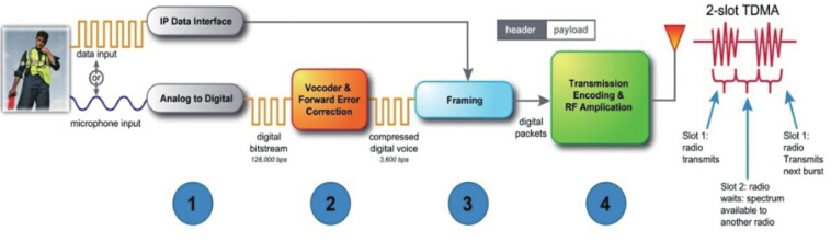 直通模式下兩時隙同時通話 時隙1 用作某一通話的同時,時隙2 可用作另一通話。 延長電池使用時間 P3688數(shù)字對講機發(fā)射或接收時,只占用1個時隙間斷進(jìn)行,而不是像模擬對講機一樣持續(xù)發(fā)射,可節(jié)省大量電池電量,使對講機的電池工作時間延長了40%。