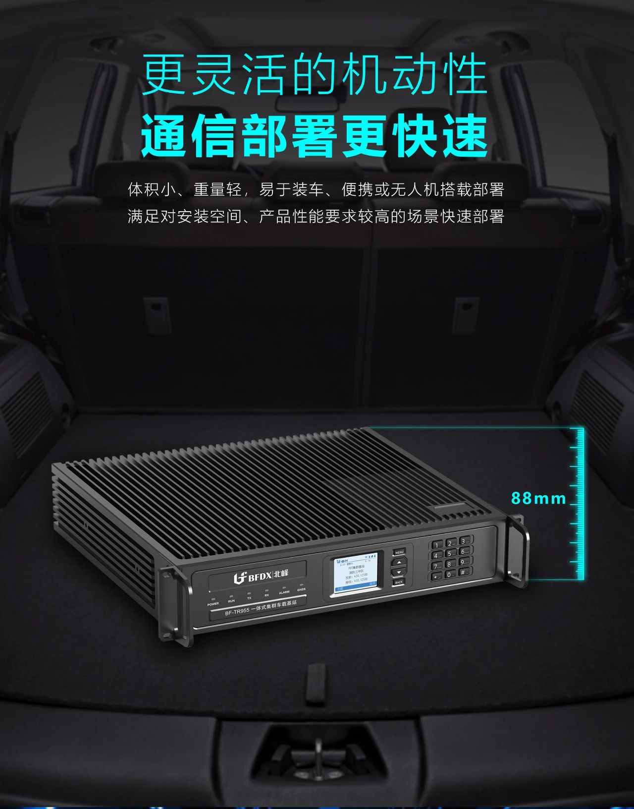 無人機可以在沒有網(wǎng)絡(luò)的情況下利用無線電遙控設(shè)備和自備的程序控制裝置并使其按照既定路線行駛的一種低空飛行設(shè)備。在突發(fā)事件發(fā)生后,公共網(wǎng)絡(luò)癱瘓的情況下,無人機可以通過搭載數(shù)字基站設(shè)備,形成空中中繼站,為救援人員提供應(yīng)急無線通信信號放大作用,在處理自然災(zāi)害、事故災(zāi)難以及社會安全事件等方面發(fā)揮快速、高效作用。 北峰BF-TR955數(shù)字車載基站采用標準19英寸2U的機架式結(jié)構(gòu)設(shè)計,體積小、重量輕、適用于對安裝空間有苛刻要求且對性能要求較高的場合,易于裝車或便攜,可在某個固定地點或部署在中小型車上,也可由無人機搭載部署,能滿足搶險救災(zāi)、應(yīng)急通信等特殊場景下大、中、小規(guī)模的快速部署。