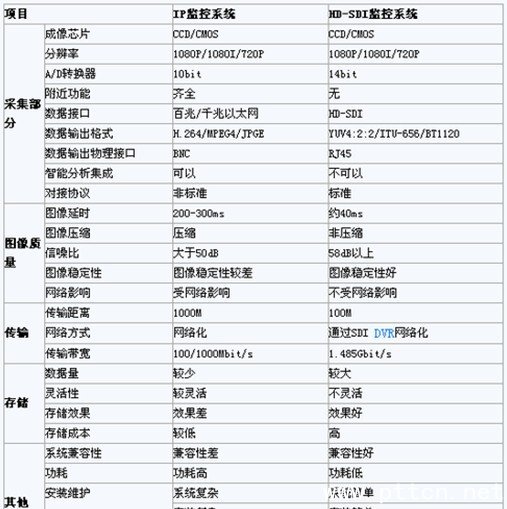 主頁(yè)(http://www.130131.com):安防監(jiān)控發(fā)展 IP高清與HD-SDI技術(shù)雙雄(2) 安防行業(yè)發(fā)展到今天,監(jiān)控系統(tǒng)數(shù)字化、高清化已經(jīng)是必然的趨勢(shì),更是行業(yè)內(nèi)最熱門的話題,高清視頻的應(yīng)用正如火如荼,安防內(nèi)的各大主流廠商都紛紛推出自己的高清產(chǎn)品與系統(tǒng)解決方案。IP高清監(jiān)控發(fā)展比較早,已處于成長(zhǎng)期,IP高清的產(chǎn)品款型豐富,外圍配套設(shè)備比較齊全,涌現(xiàn)出各種IP高清系統(tǒng)解決方案,并成為目前高清視頻監(jiān)控應(yīng)用方案的主流。盡管IP高清監(jiān)控具有種種優(yōu)勢(shì),但由于各種技術(shù)與應(yīng)用的原因,對(duì)于IP高清監(jiān)控系統(tǒng)整體而言,也明顯地暴露出其軟肋與不足:由于網(wǎng)絡(luò)傳輸延遲帶來(lái)的非實(shí)時(shí)性、由于有損編碼壓縮使顯示和記錄的圖像失去原汁原味、由于對(duì)網(wǎng)絡(luò)的高帶寬和安全性等,從而影響了其應(yīng)用效果。對(duì)于上述的IP高清監(jiān)控的種種不足與應(yīng)用中的要求,廠家必須尋求更好更完善的高清解決方案。在此需求推動(dòng)下,一種新的應(yīng)用廣播級(jí)標(biāo)準(zhǔn)HD-SDI引入到安防應(yīng)用領(lǐng)域中,HD-SDI攝像機(jī)被推出面世。從此,高清監(jiān)控產(chǎn)品分為IP高清和HD-SDI高清兩大陣營(yíng)。 無(wú)論是IP高清監(jiān)控還是HD-SDI監(jiān)控,兩種截然不同的技術(shù)和傳輸方式導(dǎo)致兩種產(chǎn)品在系統(tǒng)應(yīng)用和市場(chǎng)定位上表現(xiàn)出截然不同的特征,它們都有自己獨(dú)有的應(yīng)用領(lǐng)域與技術(shù)特點(diǎn),IP高清監(jiān)控與HD-SDI監(jiān)控誓與爭(zhēng)雄?本文作者將客觀從產(chǎn)品技術(shù)、行業(yè)應(yīng)用與用戶接受度的角度給予全面分析比較二者的優(yōu)劣勢(shì): 產(chǎn)品技術(shù)層面: 首先我們可以根據(jù)一張表格來(lái)看出IP監(jiān)控系統(tǒng)與HD-SDI監(jiān)控系統(tǒng)的區(qū)別