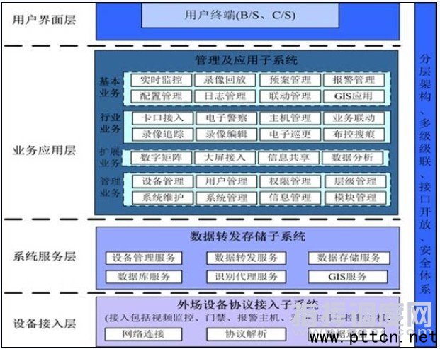 平臺軟件功能結(jié)構(gòu)圖 用戶界面層 系統(tǒng)整體采用B/S的展現(xiàn)模式,其中視頻顯示的模塊應(yīng)用了C/S的嵌入插件形式。充分發(fā)揮了B/S模式異地瀏覽的方便性,任何時間、任何地點、任何系統(tǒng)中,只要網(wǎng)絡(luò)連通,就可以直接使用瀏覽器連接服務(wù)器,任何電腦都可以作為客戶端使用。同時綜合利用了C/S模式信息采集靈活、負載均衡、服務(wù)穩(wěn)定等的優(yōu)勢,保證了客戶端有更多的事務(wù)處理能力,分流服務(wù)器的工作負擔,使整個系統(tǒng)運行更加穩(wěn)定。 用戶界面層是DSS平臺軟件直接跟用戶交互的窗口。 業(yè)務(wù)應(yīng)用層 系統(tǒng)業(yè)務(wù)應(yīng)用層主要是面對用戶的系統(tǒng)客戶端功能呈現(xiàn),在這里,既有視頻監(jiān)控行業(yè)的基本型功能業(yè)務(wù),如:實時監(jiān)視、錄像回放、日志管理等;也有為交通行業(yè)用戶針對設(shè)計的行業(yè)應(yīng)用功能業(yè)務(wù),如:卡口管理、電子警察管理、車牌識別、布撤控等等;還有為系統(tǒng)整體性、用戶使用便捷考慮而增加的對系統(tǒng)一些監(jiān)控外圍擴展應(yīng)用設(shè)備接入而設(shè)計的系統(tǒng)功能擴展業(yè)務(wù),如:大屏接入、數(shù)字矩陣等;另外就是為系統(tǒng)自身穩(wěn)定高效運行,方便用戶對整個系統(tǒng)所有設(shè)備、用戶、任務(wù)等做監(jiān)控和管理的系統(tǒng)管理業(yè)務(wù)功能,如:設(shè)備管理、用戶管理、權(quán)限管理、錄像計劃等等;