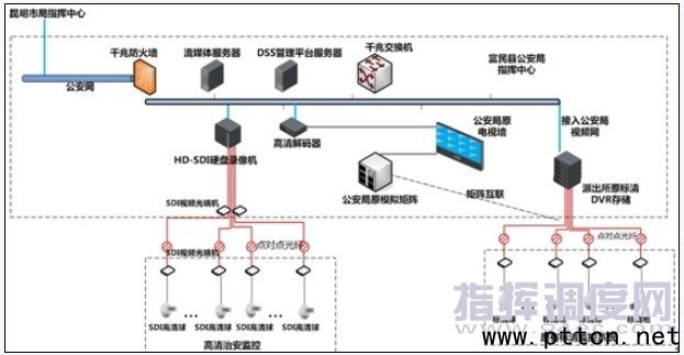 主頁(http://www.130131.com):大華助力昆明富民縣區(qū)視頻監(jiān)控系統(tǒng)建設(shè)(2) 按照公安網(wǎng)安全管理的有關(guān)規(guī)定和《昆明市城市報警與監(jiān)控系統(tǒng)建設(shè)實施方案》(昆公科發(fā)〔2007〕15號)要求,前端攝像機以HD-SDI高清方式傳輸至監(jiān)控中心,經(jīng)高清數(shù)字化編碼后進入公安網(wǎng);為確保新增高清視頻監(jiān)控圖像能與現(xiàn)有系統(tǒng)融合接入管理,縣局監(jiān)控中心需增加DSS管理平臺,編碼支持HD-SDI信號輸入,支持HD-SDI高清輸出。