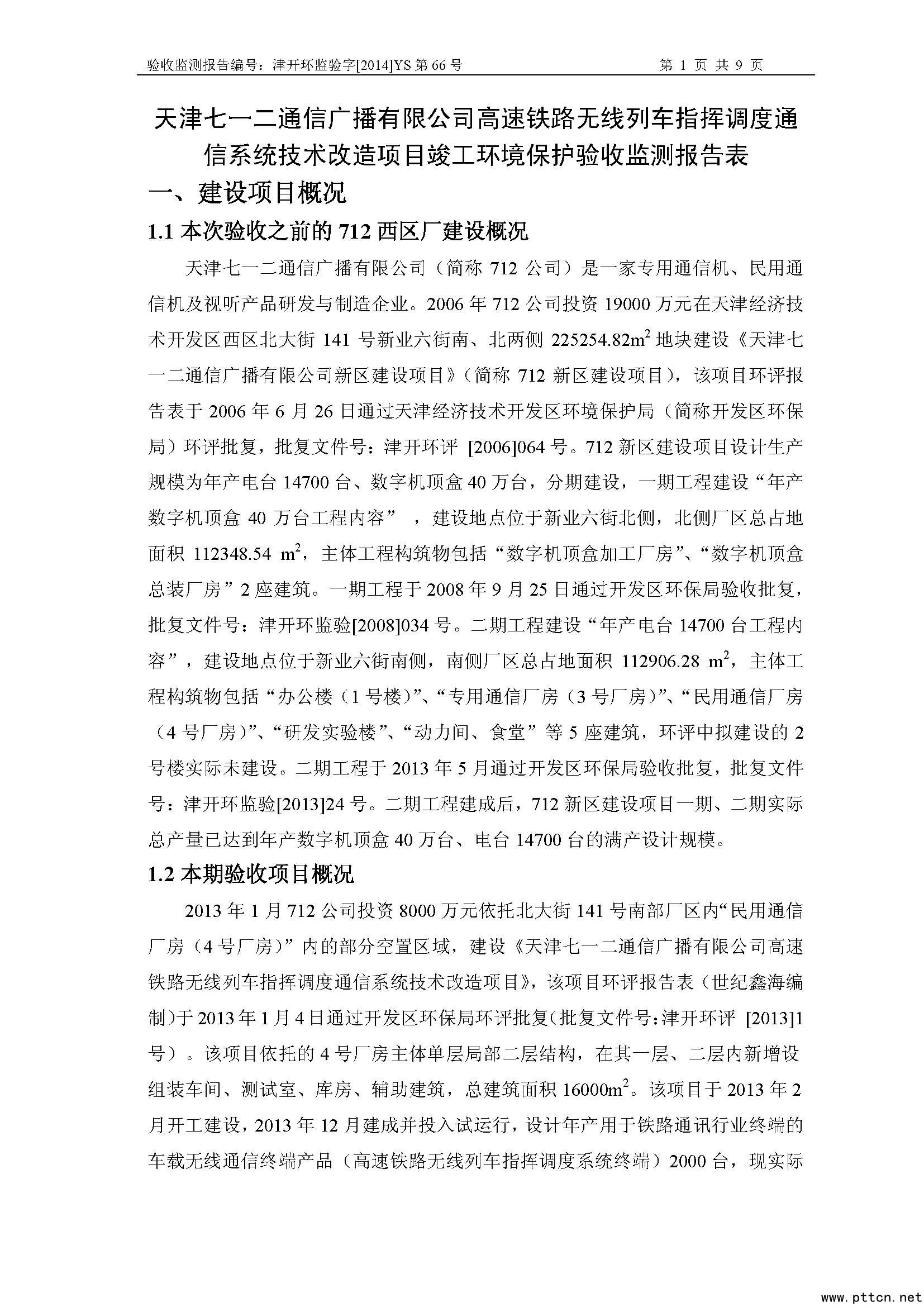 主頁(http://www.130131.com):七一二完成“高速鐵路無線列車指揮調(diào)度通信系統(tǒng)技術改造項目”竣 建設項目竣工環(huán)境保護 驗收監(jiān)測報告表 (津開)環(huán)監(jiān)驗字[2014]YS第66號 項目名稱:天津七一二通信廣播有限公司 高速鐵路無線列車指揮調(diào)度通信系統(tǒng)技術改造項目 委托單位:天津七一二通信廣播有限公司 天津經(jīng)濟技術開發(fā)區(qū) 環(huán)境保護監(jiān)測站 2014年9月 承擔單位: 天津經(jīng)濟技術開發(fā)區(qū)環(huán)境保護監(jiān)測站 站 長: 盧鋼 項目負責人: 何富生 報告表編寫: 何富生 審 核: 審 定: 協(xié)作單位:天津津濱華測產(chǎn)品檢測中心有限公司 現(xiàn)場監(jiān)測負責人:何富生、高國興 監(jiān)測報告說明 1.監(jiān)測報告無本站報告專用章,多頁報告無本站專用騎縫章無效。 2. 報告未經(jīng)審核、批準無效。 3. 對現(xiàn)場不可復制的監(jiān)測,僅對監(jiān)測所代表的時間和空間負責。 4. 本報告未經(jīng)書面授權不得部分復制。 5. 監(jiān)測委托方如對監(jiān)測報告有異議,須在報告之日起十五日內(nèi)(特殊樣品除外)向本站提出,逾期不予受理。 天津經(jīng)濟技術開發(fā)區(qū)環(huán)境保護監(jiān)測站 電話:022-25281719 傳真:022-66201043 郵編: 300457 地址:天津經(jīng)濟技術開發(fā)區(qū)曉園東路5號