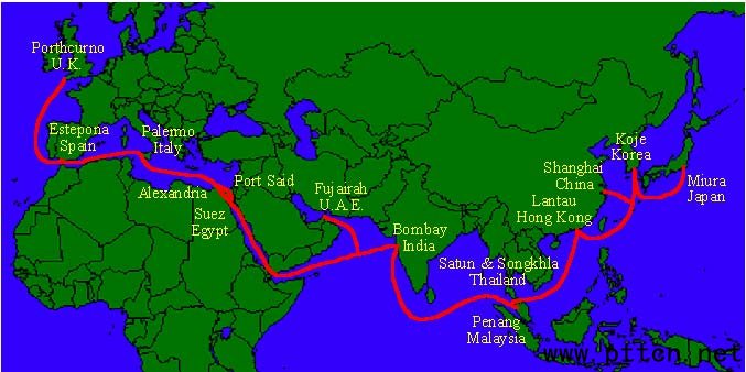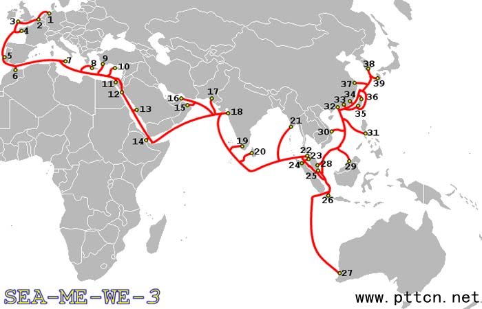 3. SEA-ME-WE 3(亞歐)海底光纜 帶寬:960Gbps 長度:39000km 經(jīng)過地區(qū):東亞,東南亞,中東,西歐。 入境地點(diǎn):汕頭,上海。 網(wǎng)址: http://en.wikipedia.org/wiki/SEA-ME-WE_3