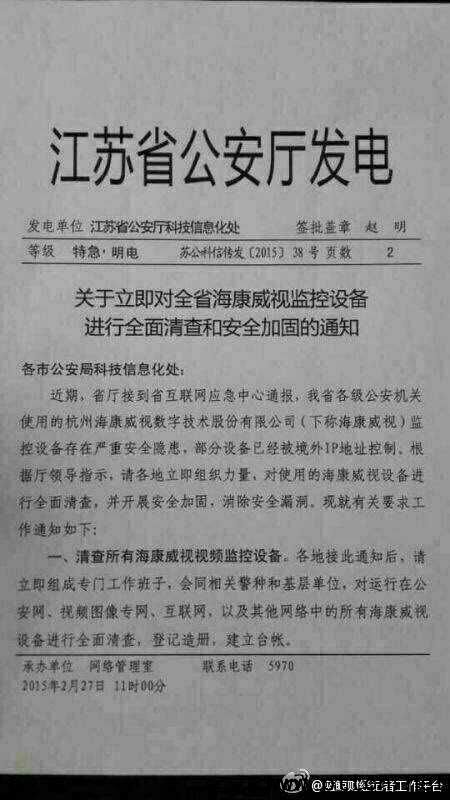 主頁(http://www.130131.com):傳?低暠O(jiān)控設(shè)備存重大漏洞,江蘇公安廳緊急全面清查 2月28日“棱鏡門”后再曝重大信息安全事故!27日中午,江蘇省公安廳發(fā)布的特急通知稱,主營安防產(chǎn)品的?低暺渖a(chǎn)的監(jiān)控設(shè)備被曝嚴(yán)重的安全隱患,部分設(shè)備已被境外IP地址控制,并要求各地立即進行全面清查,開展安全加固,消除安全隱患。