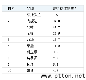 主頁(yè)(http://www.130131.com):PttCnSort:2015網(wǎng)絡(luò)媒體十大對(duì)講機(jī)影響力品牌 PttCnSort對(duì)講機(jī)品牌網(wǎng)絡(luò)媒體影響力指數(shù),通過(guò)網(wǎng)絡(luò)爬蟲(chóng)自動(dòng)采集對(duì)講機(jī)品牌在國(guó)內(nèi)主要網(wǎng)絡(luò)媒體的報(bào)道數(shù)據(jù),通過(guò)自有算法得出影響力指數(shù)。 該算法客觀,公正,無(wú)人工干預(yù)。 該影響力指數(shù)只體現(xiàn)對(duì)講機(jī)品牌在互聯(lián)網(wǎng)媒體的影響力,與線下傳統(tǒng)媒體影響力無(wú)關(guān)。 該影響力指數(shù)只體現(xiàn)2015年全年數(shù)據(jù),不累計(jì)2015年1月1日前數(shù)據(jù)。
