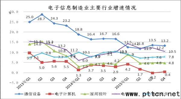 主頁(http://www.130131.com):2015年通信設(shè)備行業(yè)實現(xiàn)銷售產(chǎn)值同比增長13.2% 1月26日消息,工信部近日公布《2015年1-12月電子信息制造業(yè)運行情況》。從中獲悉,2015年1-12月,我國通信設(shè)備行業(yè)實現(xiàn)銷售產(chǎn)值同比增長13.2%,低于去年同期3.4個百分點,內(nèi)銷產(chǎn)值同比增長18.6%,高于去年同期2.2個百分點。 數(shù)據(jù)顯示,2015年1-12月,我國電子信息制造業(yè)的銷售產(chǎn)值同比增長8.7%,內(nèi)銷值同比增長17.3%。從內(nèi)外銷角度看,1-12月,規(guī)模以上電子信息制造業(yè)內(nèi)銷產(chǎn)值同比增長17.3%,出口交貨值同比下降0.1%。從內(nèi)外資角度看,1-12月,內(nèi)資企業(yè)的銷售產(chǎn)值同比增長17.8%,港澳臺投資企業(yè)銷售產(chǎn)值同比增長8.3%,外商投資企業(yè)銷售產(chǎn)值同比下降0.1%。 從收入和利潤角度看,1-11月,電子信息制造業(yè)全行業(yè)實現(xiàn)主營業(yè)務(wù)收入99684億元,同比增長8%,實現(xiàn)利潤4652億元,同比增長11.5%。