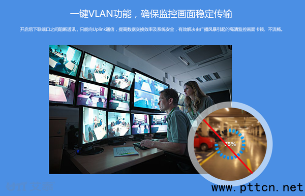 一鍵VLAN功能 提升網(wǎng)絡(luò)安全 S110P艾泰安防監(jiān)控專用交換機,特有的一鍵VLAN功能,開啟后交換機下聯(lián)端口阻斷通訊,只能向上聯(lián)口轉(zhuǎn)發(fā)數(shù)據(jù),提高數(shù)據(jù)交換效率及系統(tǒng)安全,同時有效解決由廣播風暴引起的高清監(jiān)控畫面卡頓、不流暢的問題。