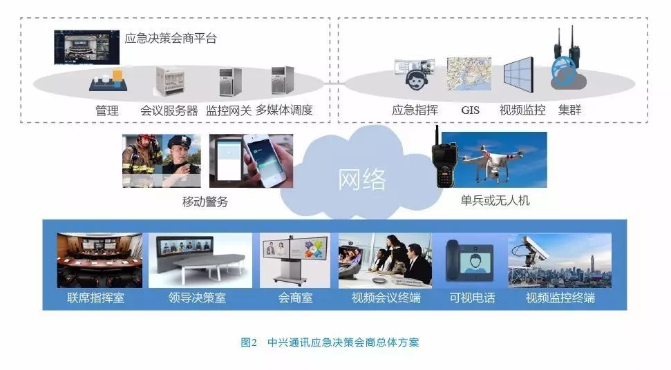 中興通訊應(yīng)急決策會(huì)商系統(tǒng)總體方案如圖2所示,通過監(jiān)控網(wǎng)關(guān)和多媒體調(diào)度,將視頻會(huì)議與應(yīng)急指揮和監(jiān)控系統(tǒng)無縫對(duì)接,語(yǔ)音、視頻和GIS成為統(tǒng)一載體,實(shí)現(xiàn)全網(wǎng)統(tǒng)一通信和多媒體指揮。
