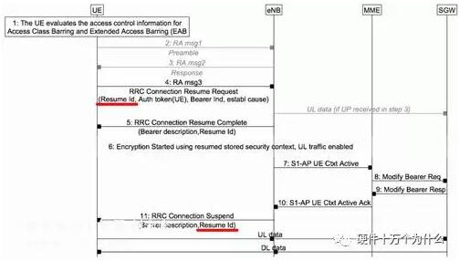 每個Symbol Group之間會有跳頻(FrequencyHopping)。選擇傳送的Random Access Preamble即是選擇起始的Subcarrier。 協(xié)議層的變更 依據(jù)3GPP的規(guī)劃,RAN2將NB-IoT在協(xié)議層規(guī)畫了兩種數(shù)據(jù)傳輸模式。分別是控制平面(Control Plane,CP)解決方案與使用者平面(User Plane, UP)解決方案。其中CP解決方案是必要支持,UP解決方案為額外支持的選項。 。瓹P解決方案 NB-IoT UE并不與基地臺建立DRB(Data Radio Bearer)而只透過建立的SRB(Signaling Radio Bearer)來傳遞少量的數(shù)據(jù)。 .UP解決方案 基地臺與NB-IoT UE之間新增了一個名叫Suspend-Resume的程序。其目的在于降低NB-IoT UE在RRC聯(lián)機模式(Connected Mode)與閑置模式(Idle Mode)之間切換時所需要交換的訊息數(shù)量,藉此節(jié)省NB-IoT UE的能源消耗(Power Consumption)。實際的作法如圖4,當(dāng)基地臺在NB-IoT UE不需要RRC聯(lián)機時下達指令讓該裝置進入Suspend模式,而該Suspend指令中會夾帶一組Resume ID(如圖4,步驟11)。 不同于以往從RRC聯(lián)機模式至閑置模式的過程,基地臺與NB-IoT UE間會盡可能地保留在RRC聯(lián)機模式下所使用的無線資源分配以及相關(guān)安全性配置。當(dāng)NB-IoT UE欲進行數(shù)據(jù)傳輸時,僅需要在Random Access程序中的第三道訊息(RRC ConnectionRequest)夾帶基地臺配給的Resume ID(如圖4,步驟4),基地臺即可以在透過此Resume ID來辨識NB-IoT UE,并且跳過相關(guān)的配置訊息交換,直接進入數(shù)據(jù)傳輸。