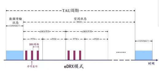通過上行、下行信道的優(yōu)化設(shè)計(jì),NB-IoT信號(hào)的“耦合損耗(coupling loss)”最高可以達(dá)到164dB。 (備注: 耦合損耗,指能量從一個(gè)電路系統(tǒng)傳播到另一個(gè)電路系統(tǒng)時(shí)發(fā)生的能量損耗。這里是指無線信號(hào)在空中傳播的能量損耗) 為了進(jìn)一步利用網(wǎng)絡(luò)系統(tǒng)的信號(hào)覆蓋能力,NB-IoT還根據(jù)信號(hào)覆蓋的強(qiáng)度進(jìn)行了分級(jí)(CE Level),并實(shí)現(xiàn)“尋呼優(yōu)化”:引入PTW(尋呼傳輸窗),允許網(wǎng)絡(luò)在一個(gè)PTW內(nèi)多次尋呼UE,并根據(jù)覆蓋等級(jí)調(diào)整尋呼次數(shù)。 常規(guī)覆蓋(Normal Coverage),其MCL(Maximum Coupling Loss,最大耦合損耗)小于144dB,與目前的GPRS覆蓋一致。 擴(kuò)展覆蓋(Extended Coverage),其MCL介于144dB與154dB之間,相對(duì)GPRS覆蓋有10dB的增強(qiáng) 極端覆蓋(Extreme Coverage),其MCL最高可達(dá)164dB,相對(duì)GPRS覆蓋強(qiáng)度提升了20dB。 3. NB-IoT低功耗的實(shí)現(xiàn) 要終端通信模塊低功耗運(yùn)行,最好的辦法就是盡量地讓其“休眠”。NB-IoT有兩種模式,可以使得通信模塊只在約定的一段很短暫的時(shí)間段內(nèi),監(jiān)聽網(wǎng)絡(luò)對(duì)其的尋呼,其它時(shí)間則都處于關(guān)閉的狀態(tài)。這兩種“省電”模式為:PSM(power saving mode,省電模式)和eDRX(Extended Discontinuous Reception,擴(kuò)展的不連續(xù)接收) (1) PSM模式 在PSM模式下,終端設(shè)備的通信模塊進(jìn)入空閑狀態(tài)一段時(shí)間后,會(huì)關(guān)閉其信號(hào)的收發(fā)以及接入層的相關(guān)功能。當(dāng)設(shè)備處于這種局部關(guān)機(jī)狀態(tài)的時(shí)候,即進(jìn)入了省電模式-PSM。終端以此可以減少通信元器件(天線、射頻等)的能源消耗。 終端進(jìn)入省電模式期間,網(wǎng)絡(luò)是無法訪問到該終端。從語音通話的角度來說,即“無法被叫”。 大多數(shù)情況下,采用PSM的終端,超過99%的時(shí)間都處于休眠的狀態(tài),主要有兩種方式可以激活他們和網(wǎng)絡(luò)的通信: 當(dāng)終端自身有連接網(wǎng)絡(luò)的需求時(shí),它會(huì)退出PSM的狀態(tài),并主動(dòng)與網(wǎng)絡(luò)進(jìn)行通信,上傳業(yè)務(wù)數(shù)據(jù)。 在每一個(gè)周期性的TAU (Tracking Area Update,跟蹤區(qū)更新)中,都有一小段時(shí)間處于激活的狀態(tài)。在激活狀態(tài)中,終端先進(jìn)入“連接狀態(tài)(Connect)”,與通信網(wǎng)絡(luò)交互其網(wǎng)絡(luò)、業(yè)務(wù)的數(shù)據(jù)。在通信完成后,終端不會(huì)立刻進(jìn)入PSM狀態(tài),而是保持一段時(shí)間為“空閑狀態(tài)(IDLE)”。在空閑狀態(tài)狀態(tài)下,終端可以接受網(wǎng)絡(luò)的尋呼。 在PSM的運(yùn)行機(jī)制中,使用“激活定時(shí)器(Active Timer,簡(jiǎn)稱AT)”控制空閑狀態(tài)的時(shí)長(zhǎng),并由網(wǎng)絡(luò)和終端在網(wǎng)絡(luò)附著(Attach,終端首次登記到網(wǎng)絡(luò))或TAU時(shí)協(xié)商決定激活定時(shí)器的時(shí)長(zhǎng)。終端在空閑狀態(tài)下出現(xiàn)AT超時(shí)的時(shí)候,便進(jìn)入了PSM狀態(tài)。 根據(jù)標(biāo)準(zhǔn),終端的一個(gè)TAU周期最大可達(dá)310H(小時(shí));“空閑狀態(tài)”的時(shí)長(zhǎng)最高可達(dá)到3.1小時(shí)(11160s)。 從技術(shù)原理可以看出,PSM適用于那些幾乎沒有下行數(shù)據(jù)流量的應(yīng)用。云端應(yīng)用和終端的交互,主要依賴于終端自主性地與網(wǎng)絡(luò)聯(lián)系。絕大多數(shù)情況下,云端應(yīng)用是無法實(shí)時(shí)“聯(lián)系“到終端的。 (2) PSM模式 在PSM模式下,網(wǎng)絡(luò)只能在每個(gè)TAU最開始的時(shí)間段內(nèi)尋呼到終端(在連接狀態(tài)后的空閑狀態(tài)進(jìn)行尋呼)。eDRX模式的運(yùn)行不同于PSM,它引入了eDRX機(jī)制,提升了業(yè)務(wù)下行的可達(dá)性。 (備注:DRX(Discontinuous Reception),即不連續(xù)接收。eDRX就是擴(kuò)展的不連續(xù)接收。) eDRX模式,在一個(gè)TAU周期內(nèi),包含有多個(gè)eDRX周期,以便于網(wǎng)絡(luò)更實(shí)時(shí)性地向其建立通信連接(尋呼)。 eDRX的一個(gè)TAU包含一個(gè)連接狀態(tài)周期和一個(gè)空閑狀態(tài)周期,空閑狀態(tài)周期中則包含了多個(gè)eDRX尋呼周期,每個(gè)eDRX尋呼周期又包含了一個(gè)PTW周期和一個(gè)PSM周期。PTW和PSM的狀態(tài)會(huì)周期性地交替出現(xiàn)在一個(gè)TAU中,使得終端能夠間歇性地處于待機(jī)的狀態(tài),等待網(wǎng)絡(luò)對(duì)其的呼叫。