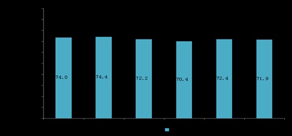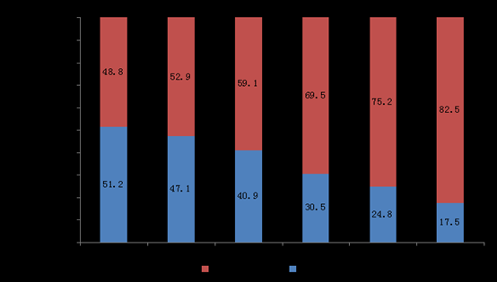 全年固定通信業(yè)務(wù)收入完成3549億元,比上年增長8.4%。移動通信業(yè)務(wù)實現(xiàn)收入9071億元,比上年增長5.7%,在電信業(yè)務(wù)收入中占比為71.9%,較上年回落0.5個百分點。 圖1-2 2012-2017年固定通信和移動通信收入占比變化情況