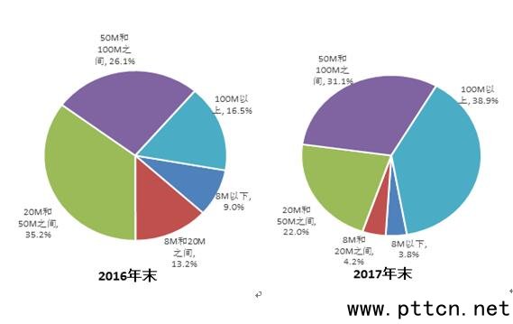 (二)網(wǎng)絡(luò)提速效果顯著,高速率寬帶用戶占比大幅提升進一步落實網(wǎng)絡(luò)提速要求,加快拓展光纖接入服務(wù)和優(yōu)化4G服務(wù),努力提升用戶獲得感。截止12月底,三家基礎(chǔ)電信企業(yè)的固定互聯(lián)網(wǎng)寬帶接入用戶總數(shù)達3.49億戶,全年凈增5133萬戶。其中,50Mbps及以上接入速率的固定互聯(lián)網(wǎng)寬帶接入用戶總數(shù)達2.44億戶,占總用戶數(shù)的70%,占比較上年提高27.4個百分點;100Mbps及以上接入速率的固定互聯(lián)網(wǎng)寬帶接入用戶總數(shù)達1.35億戶,占總用戶數(shù)的38.9%,占比較上年提高22.4個百分點。截至12月底,移動寬帶用戶(即3G和4G用戶)總數(shù)達11.3億戶,全年凈增1.91億戶,占移動電話用戶的79.8%。4G用戶總數(shù)達到9.97億戶,全年凈增2.27億戶。 圖2-2 2016-2017年固定互聯(lián)網(wǎng)寬帶各接入速率用戶占比情況