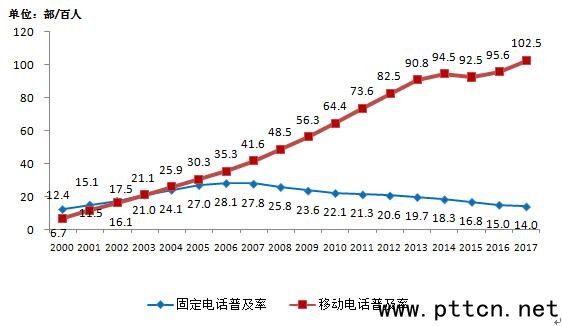 二、網(wǎng)絡(luò)提速和普遍服務(wù)效果顯現(xiàn) (一)電話用戶規(guī)模穩(wěn)步擴大,移動電話普及率首次破百2017年,全國電話用戶凈增8269萬戶,總數(shù)達到16.1億戶,比上年增長5.4%。其中,移動電話用戶凈增9555萬戶,總數(shù)達14.2億戶,移動電話用戶普及率達102.5部/百人,比上年提高6.9部/百人,全國已有16省市的移動電話普及率超過100部/百人。固定電話用戶總數(shù)1.94億戶,比上年減少1286萬戶,每百人擁有固定電話數(shù)下降至14部。 圖2-1 2000-2017年固定電話、移動電話用戶發(fā)展情況