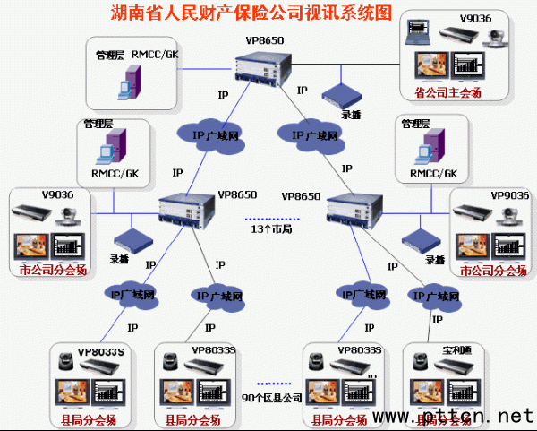主頁(http://www.130131.com):中國(guó)人保湖南分公司建設(shè)高標(biāo)清混合視頻會(huì)議系統(tǒng) 一、項(xiàng)目背景及需求分析 湖南省人民財(cái)產(chǎn)保險(xiǎn)公司視訊項(xiàng)目是湖南省人保全省性的視訊工程,原有為2004年搭建的XXX視訊系統(tǒng),為省、市二級(jí)會(huì)議系統(tǒng)共13個(gè)局點(diǎn),能夠組織開全省會(huì)議。但舊系統(tǒng)功能相對(duì)落后,穩(wěn)定性差,不能滿足湖南省人保分公司的現(xiàn)行要求。 新建華為高標(biāo)清混合視頻會(huì)議系統(tǒng)建設(shè)到縣級(jí)公司,共90個(gè)局點(diǎn)。主要功能包括:多方高清視頻會(huì)議、多方高標(biāo)清混網(wǎng)會(huì)議、桌面終端傳送功能、實(shí)現(xiàn)點(diǎn)對(duì)點(diǎn)的可視通信、提供多方視頻會(huì)議時(shí)的膠片傳送功能,提供會(huì)議的錄制、存儲(chǔ)、點(diǎn)播功能,提供會(huì)議的網(wǎng)絡(luò)直播功能。 二、設(shè)計(jì)方案 深圳市金華威數(shù)碼科技有限公司負(fù)責(zé)該項(xiàng)目的方案設(shè)計(jì)和工程實(shí)施。系統(tǒng)采用分級(jí)分權(quán)的模式,省公司集中權(quán)限。省公司MCU能調(diào)度全省會(huì)議,地市分公司能調(diào)度本地市會(huì)議。 1、 湖南省人民財(cái)產(chǎn)保險(xiǎn)公司省公司增加一臺(tái)MCU VP8650,用來連接各地市的新增視訊終端; 2、 各地市新增一臺(tái)MCU VP8650和視訊終端VP9036,終端按照統(tǒng)一規(guī)則安裝在各地市會(huì)場(chǎng),通過省廳RMCC、GK軟件統(tǒng)一管理。 3、 各區(qū)縣新增一臺(tái)視訊終端VP8033S,終端按照統(tǒng)一規(guī)則安裝在各地市會(huì)場(chǎng),通過省廳RMCC、GK軟件統(tǒng)一管理。 在省人保公司中心機(jī)房配置一臺(tái)電信級(jí)架構(gòu)、主控單元熱備、冗余電源的ViewPoint 8650 MCU,,保證系統(tǒng)的高可靠性和穩(wěn)定性,確保會(huì)議的正常召開。MCU提供4畫面會(huì)議模式,讓會(huì)場(chǎng)情況一覽無遺。在14個(gè)地州市分會(huì)場(chǎng)終端采用ViewPoint 9036分體式會(huì)議型終端,外接專業(yè)攝像機(jī)。 利用省人保公司原有網(wǎng)絡(luò),連接省公司、市公司,以及縣公司共90個(gè)局點(diǎn)。構(gòu)建成一個(gè)省、市、縣級(jí)三級(jí)視頻會(huì)議系統(tǒng),省和市級(jí)支持720P高清,縣公司為4CIF標(biāo)清的視頻系統(tǒng)。在省公司配置高清錄播服務(wù)器,實(shí)現(xiàn)對(duì)會(huì)議的全程錄播點(diǎn)播。 全網(wǎng)由省公司的SwitchCentre和ResourceManager統(tǒng)一管理,全網(wǎng)資源的統(tǒng)一調(diào)度,各地市無需要單獨(dú)設(shè)置管理系統(tǒng)及維護(hù)人員。 視訊網(wǎng)絡(luò)拓?fù)鋱D: