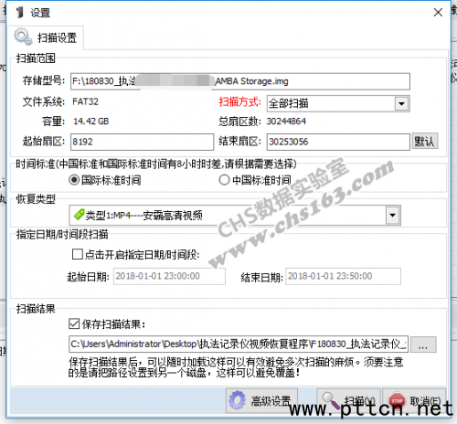 如上圖:可以看到執(zhí)法記錄儀已經(jīng)被病毒感染了 程序名稱(chēng):CHS執(zhí)法記錄儀高清視頻恢復(fù)程序 支持產(chǎn)品:安霸高清芯片全系列 好了,回到正題,看看如何恢復(fù)?實(shí)際上只需要1、2、3步就輕松搞定了。 第1步:運(yùn)行程序選擇要掃描的存儲(chǔ)卡或者鏡像文件 這一步強(qiáng)烈建議開(kāi)啟保存掃描結(jié)果,這樣如果遇到什么突發(fā)情況直接加載就行,省去了重新掃描的麻煩!