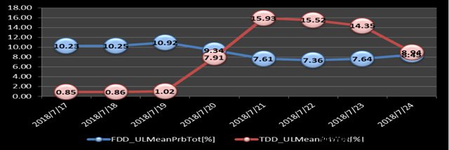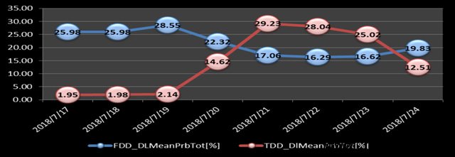 如上圖,TDD上行PRB利用率由0.85%提升至8.94%,F(xiàn)DD上行PRB利用率由10.23%下降至8.45%。 3.3 下行PRB利用率
