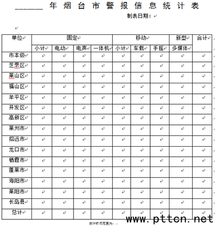 圖4 添加模塊部分界面圖 工作中,當(dāng)某一個(gè)地點(diǎn)的警報(bào)器拆除不用,就應(yīng)當(dāng)在數(shù)據(jù)庫(kù)中將對(duì)應(yīng)的數(shù)據(jù)刪除,不再進(jìn)行統(tǒng)計(jì)。在刪除模塊中,輸入對(duì)應(yīng)臺(tái)站號(hào),查詢(xún)到將刪除的警報(bào)信息,點(diǎn)擊刪除按鈕,即將數(shù)據(jù)庫(kù)中該臺(tái)警報(bào)器信息完全刪除。 當(dāng)某一臺(tái)警報(bào)信息出現(xiàn)變動(dòng),例如聯(lián)系人改動(dòng)、警報(bào)類(lèi)型、相應(yīng)設(shè)備更換等原因,需要對(duì)某些信息因素進(jìn)行修改,則在修改模塊輸入對(duì)應(yīng)臺(tái)站號(hào),查詢(xún)到該臺(tái)警報(bào)器的詳細(xì)情況,在對(duì)應(yīng)信息因素輸入框(或選擇框)中填寫(xiě)上新的信息,修改完畢后點(diǎn)擊“修改”按鈕,則該臺(tái)警報(bào)器信息修改完畢,數(shù)據(jù)庫(kù)隨之更新。 (三)統(tǒng)計(jì)模塊的應(yīng)用 統(tǒng)計(jì)警報(bào)信息模塊(見(jiàn)圖5),先設(shè)置時(shí)間段、縣市區(qū)、警報(bào)類(lèi)型等限制條件查詢(xún)到所有的所需警報(bào),然后根據(jù)需要將查詢(xún)結(jié)果統(tǒng)計(jì)輸出到Excel表中或者輸出到word文件中。例如當(dāng)管理者想將查詢(xún)的特定條件的數(shù)據(jù)導(dǎo)出到Excel文件中,可以在查詢(xún)結(jié)果后,點(diǎn)擊“導(dǎo)出到Excel”按鈕,在彈出的對(duì)話框中設(shè)置好路徑和文件名,即可將軟件顯示的數(shù)據(jù)表完全導(dǎo)出到Excel中,得到相應(yīng)的數(shù)據(jù)文件。另外,本工程統(tǒng)計(jì)模塊最主要功能是得到某個(gè)時(shí)間段(如2018年1月到2018年11月)各縣市區(qū)(包括市本級(jí))的各類(lèi)型(電動(dòng)、電聲、一體機(jī)、車(chē)載、手搖、多媒體等)的警報(bào)統(tǒng)計(jì)數(shù)量?梢韵仍O(shè)置所需時(shí)間段,其余條件如“縣市區(qū)”、“警報(bào)類(lèi)型”等選擇“全部”,點(diǎn)擊“查詢(xún)”按鈕,在軟件界面得到符合條件的所有警報(bào)數(shù)量及詳細(xì)情況,然后點(diǎn)擊“統(tǒng)計(jì)表”按鈕,即可得到已填寫(xiě)數(shù)據(jù)的圖5所示的Word文件統(tǒng)計(jì)表。該模塊可以準(zhǔn)確無(wú)誤的計(jì)算相應(yīng)時(shí)間段各縣市區(qū)各類(lèi)型警報(bào)的新增數(shù)量和累計(jì)數(shù)量,在警報(bào)統(tǒng)計(jì)的工作中大大提高了工作效率和準(zhǔn)確性。