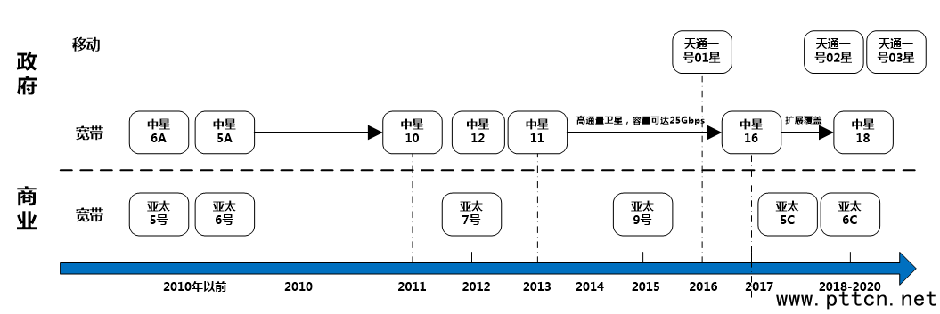 圖 1我國(guó)衛(wèi)星通信系統(tǒng)發(fā)展歷程 民用衛(wèi)星通信領(lǐng)域,主要建設(shè)發(fā)展中星、亞太系列通信廣播衛(wèi)星系統(tǒng),通信業(yè)務(wù)基本實(shí)現(xiàn)亞洲、歐洲、非洲、太平洋等區(qū)域覆蓋,在全球衛(wèi)星空間段運(yùn)營(yíng)服務(wù)商排名第六位。目前,在軌運(yùn)行C、Ku、Ka頻段的民用通信衛(wèi)星共15顆。我國(guó)高通量寬帶衛(wèi)星發(fā)展剛剛起步,整體技術(shù)水平、系統(tǒng)容量和服務(wù)能力與國(guó)外先進(jìn)衛(wèi)星系統(tǒng)尚有差距,2017年發(fā)射的首顆高通量Ka寬帶衛(wèi)星“中星16號(hào)”,容量達(dá)到20Gbps。2016年我國(guó)發(fā)射的“天通一號(hào)”01星是我國(guó)自主建設(shè)的首顆移動(dòng)通信衛(wèi)星,采用透明轉(zhuǎn)發(fā)器,窄帶單載波傳輸體制,常規(guī)模式業(yè)務(wù)支持最低1.2Kbps電路域話(huà)音、最高分組域384Kbps的數(shù)據(jù)業(yè)務(wù)。