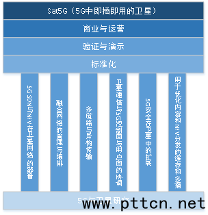 圖 5 3GPP非陸地網(wǎng)絡(luò)架構(gòu)示意圖 ③Sat5G 2017年6月,BT、Avanti、SES、University of Surrey等16家企業(yè)及研究機(jī)構(gòu)聯(lián)合成立了SaT5G(Satellite and Terrestrial Network for 5G)聯(lián)盟,計(jì)劃在30個(gè)月內(nèi)完成衛(wèi)星與5G的無(wú)縫集成方案,并進(jìn)行試用。整個(gè)項(xiàng)目將完成以下6個(gè)方面的工作: 1) 定義和評(píng)估將星地5G融合的網(wǎng)絡(luò)體系結(jié)構(gòu)解決方案; 2) 研究星地5G融合的商業(yè)價(jià)值主張; 3) 定義和開(kāi)發(fā)星地5G融合的相關(guān)關(guān)鍵技術(shù); 4) 在實(shí)驗(yàn)室的測(cè)試環(huán)境中驗(yàn)證關(guān)鍵技術(shù); 5) 對(duì)星地5G融合的特性和用例進(jìn)行演示; 6) 推進(jìn)星地5G融合在3GPP和ETSI中的標(biāo)準(zhǔn)化工作。 為了實(shí)現(xiàn)衛(wèi)星通信與5G的即插即用,Sat5G提出了6大技術(shù)研究支柱,開(kāi)展重點(diǎn)研究工作,如圖 6所示。