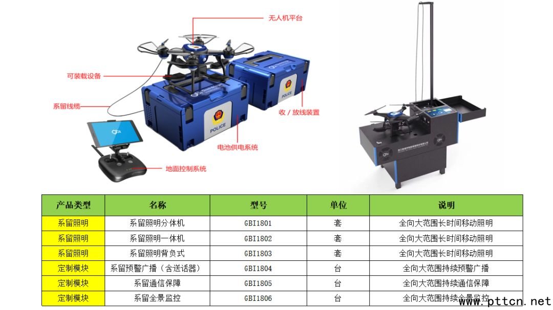 GBI1802型系留高空照明——技術(shù)參數(shù): 1、旋轉(zhuǎn)控制角度范圍: -45度~+45度 2、功 率: 400W(4個LED燈組) 3、光通量:65000 lm(單位:流明) 4、抗風等級:3-5級 5、操控方式:遙控器、手機平板、系統(tǒng)平臺 6、最佳照明范圍:最佳照明效果在20米高度下,可覆蓋面積約3000㎡ 7、供電方式:鋰電池模組+系留線纜,攜帶重量為30公斤左右 8、續(xù)航時間:2h(采用電池組),24h不間斷(外置電組) 9、產(chǎn)品尺寸:長720mm寬400mm高370mm 應(yīng)急通信/喊話器 應(yīng)急通信系統(tǒng)指突發(fā)緊急情況、通信需求驟增時的通信保障。一旦發(fā)生自然災(zāi)害,可以及時傳遞災(zāi)情、保障救災(zāi)指揮調(diào)度、滿足災(zāi)區(qū)民眾的聯(lián)絡(luò)需求。 系留式無人機載基站、對周邊15公里進行無線信號覆蓋,實現(xiàn)高空照明、空中定點監(jiān)視、遠距離通信中繼等功能。